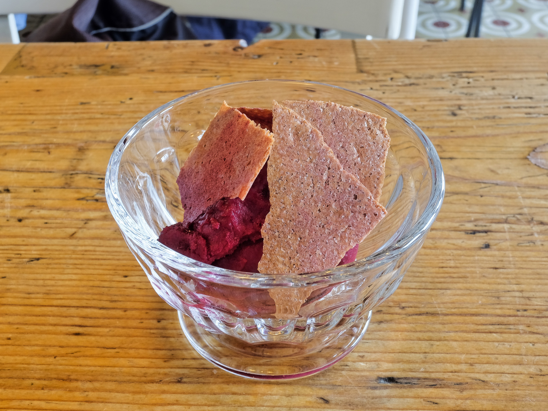 Das Rote Beete Sorbet hatte eine zart cremige Textur und ein feines, nicht erdiges Aroma. Sehr lecker.