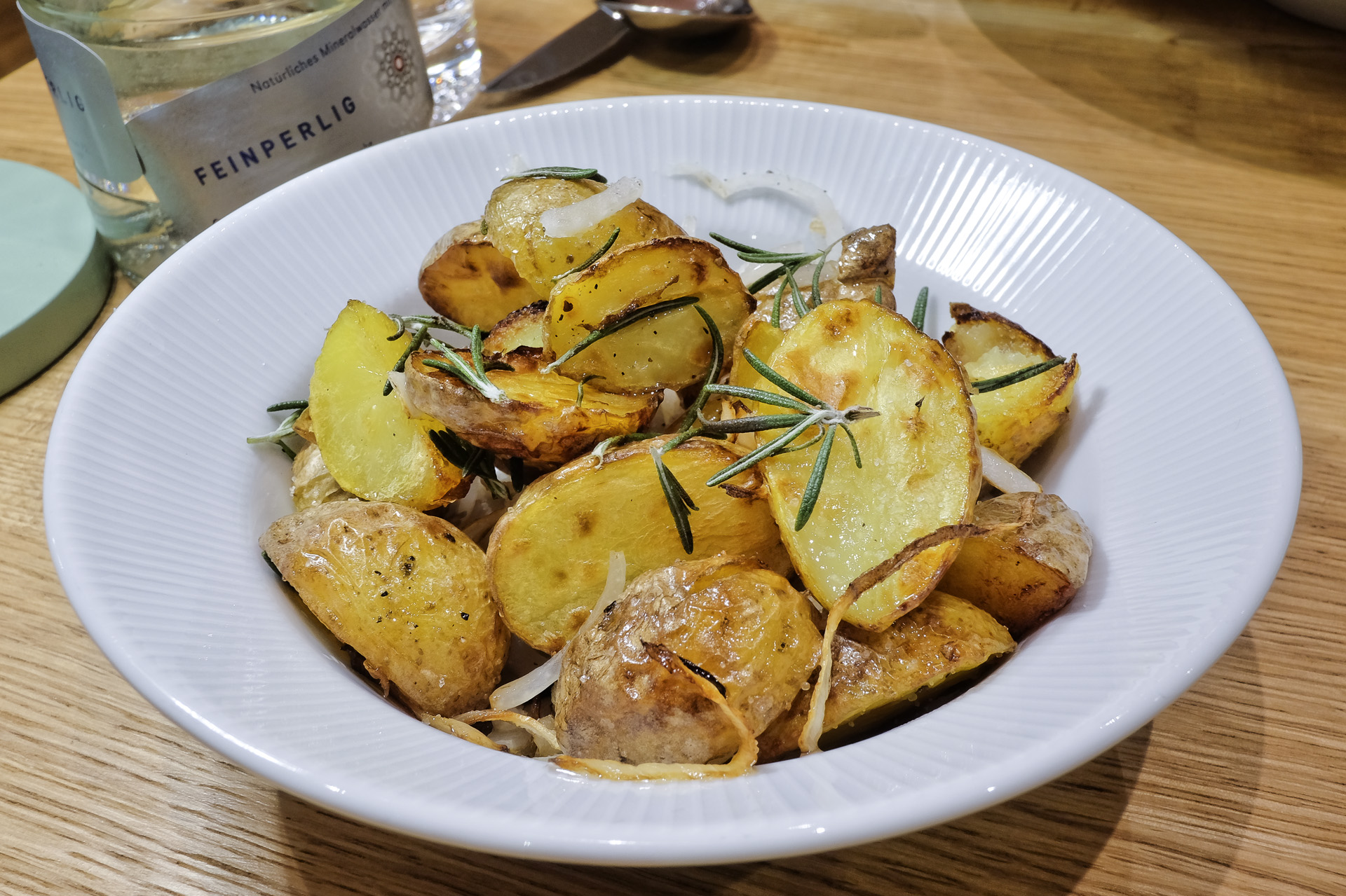 Die Ofenkartoffeln hatten ein feines Aroma, die Zwiebeln sahen zwar roh aus aber sie waren zart mit feinem leicht süßlichem Aroma. Auf das viele Rosmarin hätte ich gerne verzichtet. Sehr lecker.