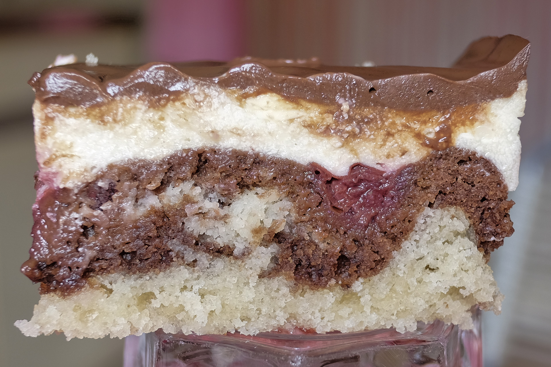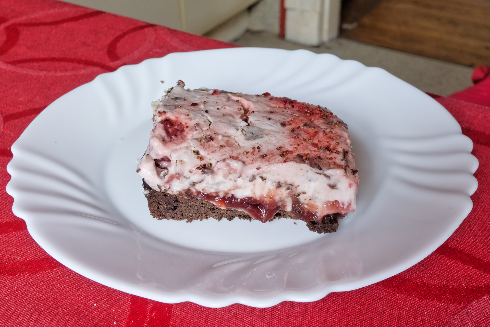 Die Donauwelle bestand aus einem Sand- oder Rührteig, der teilweise mit Kakao aromatisiert war, Sauerkirschen, einer Art zarter "Buttercreme" und einer zarten weichen Schokoladen Glasur. Der Teig war etwas pappig und es fehlte einfach etwas Fett. Für einen veganen Kuchen aber sehr lecker.