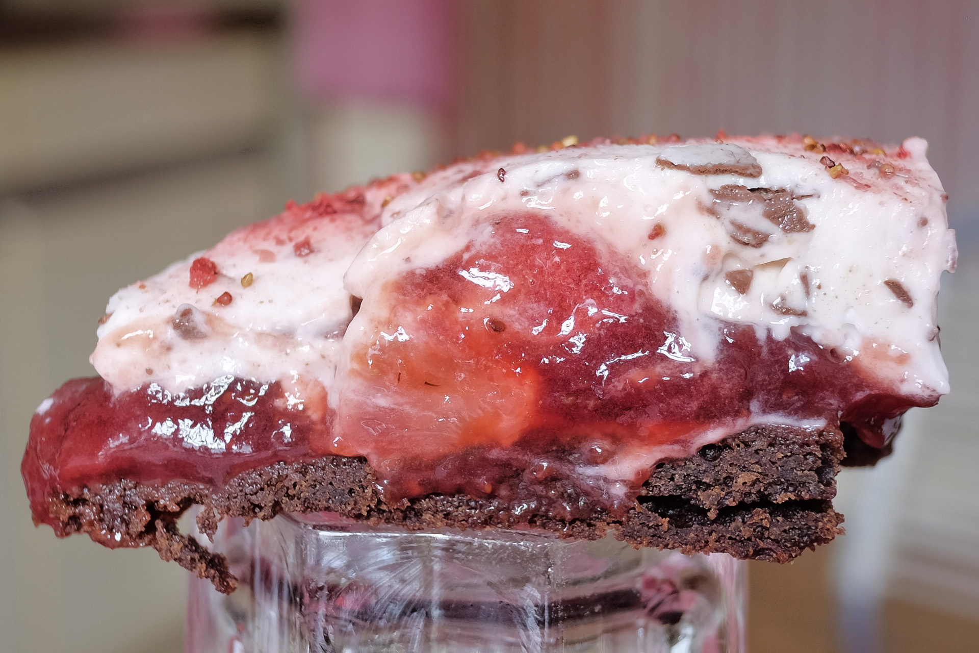Ein saftiger Schokoteig trifft auf eine wunderbar leichte, frische Creme und sonnengereifte Erdbeeren – geschmacklich verblüffend nah am Klassiker mit rosa Papier. Dieser vegane Kuchen bringt Yogurette-Vibes ganz ohne Kompromisse. (Zitat Kjeks)