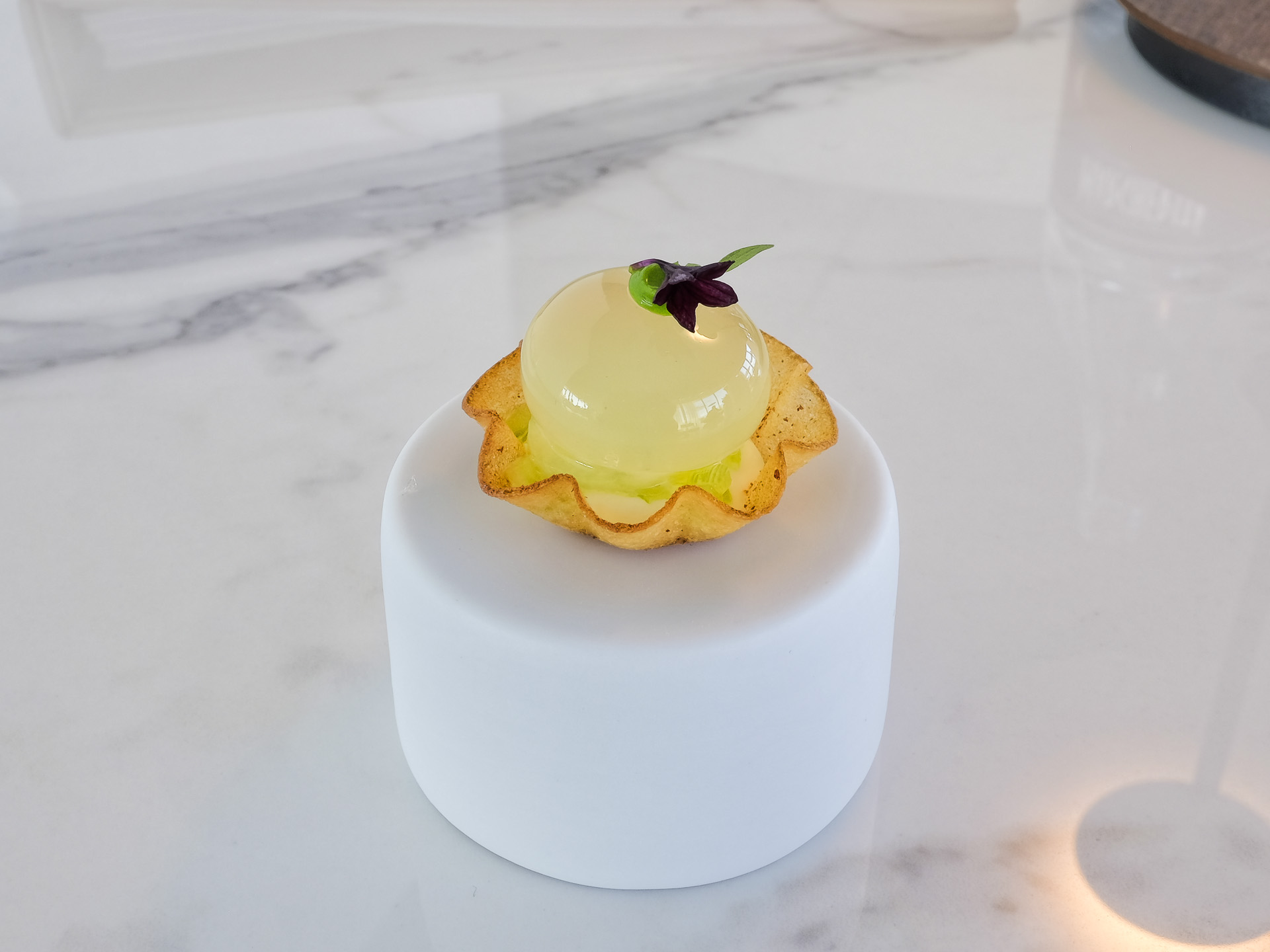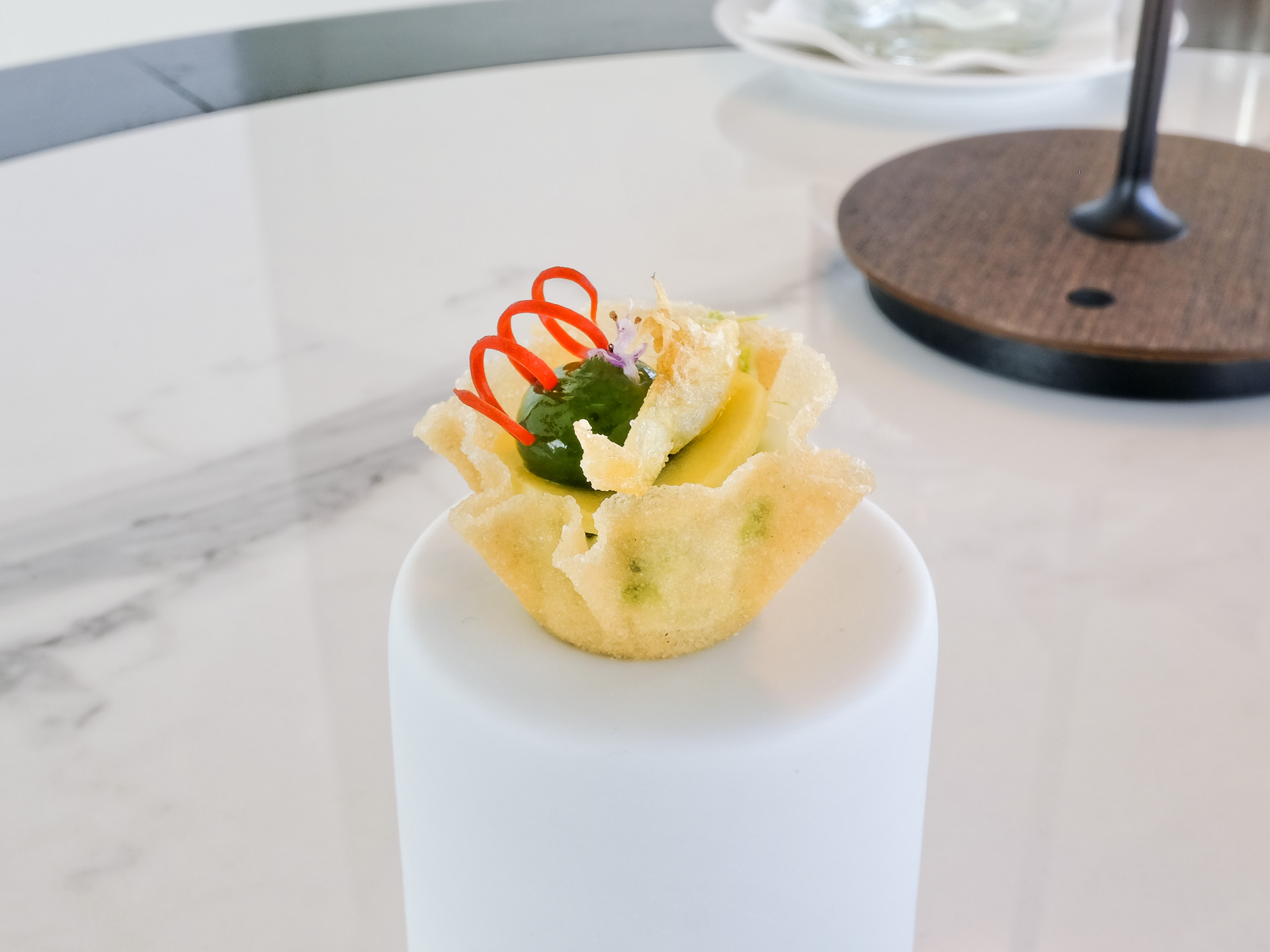 Ein Tartelette mit Glasgarnele und "Leche de Tigre". Frisch mit einem Hauch Säure und Schärfe und feinem Aroma, sehr lecker.