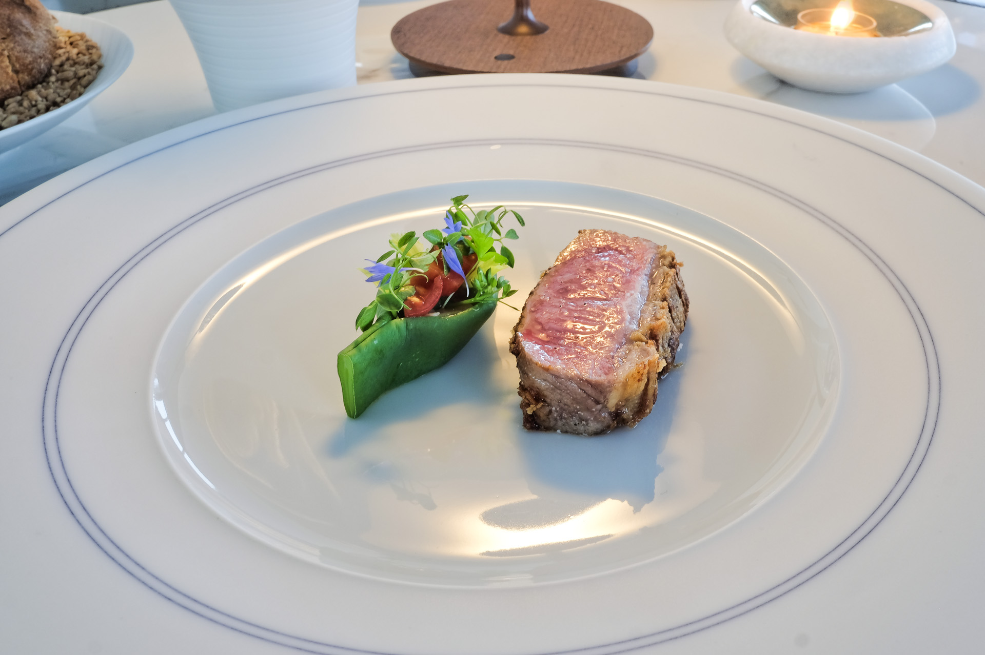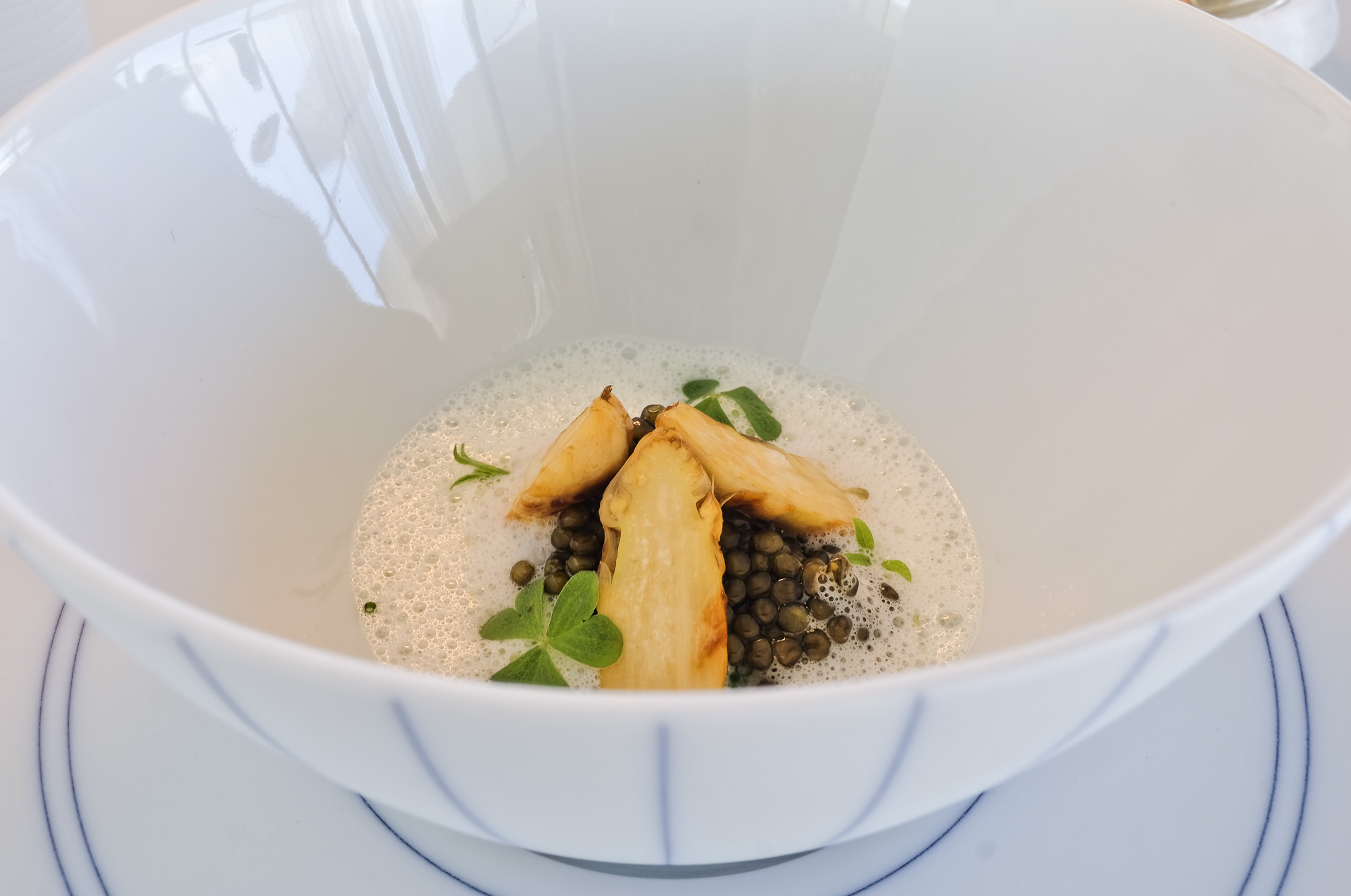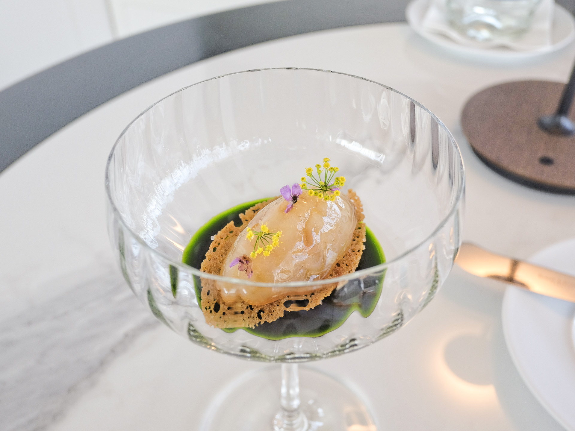 Auf einer sehr zarten Chawanmushi waren etwas Kaviar und Spargelspitzen angerichtet, dazu gab es einen Schaum mit Zitronenverbene. Der Spargel war angenehm al dente und hatte ein feines Aroma. Sehr lecker.