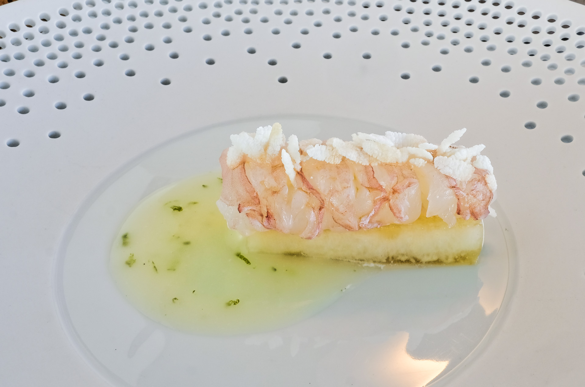 Der rohe Kaisergranat lag auf einem Bett aus "Piel de Sapo" Melone und einem Schmand Gelee, bedeckt war er mit etwas Puffreis. Dazu gab es eine Limetten Vinaigrette. Die Melone war schön reif und aromatisch, die Vinaigrette hatte eine feine Säure mit leicht herben Noten. Der Kaisergranat war zart und hatte ein feines Aroma, ich finde gebraten kommt sein Aroma aber besser zur Geltung. Sehr lecker.