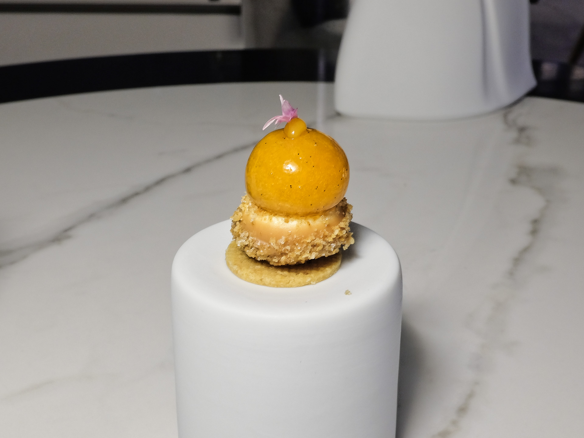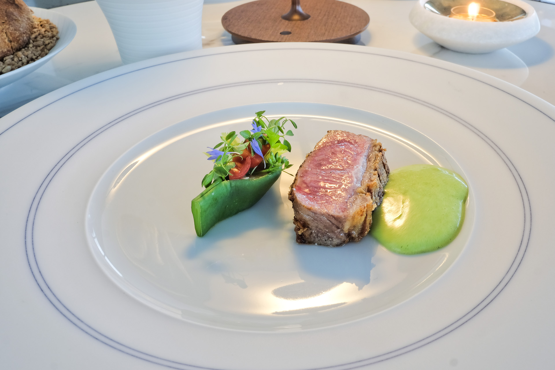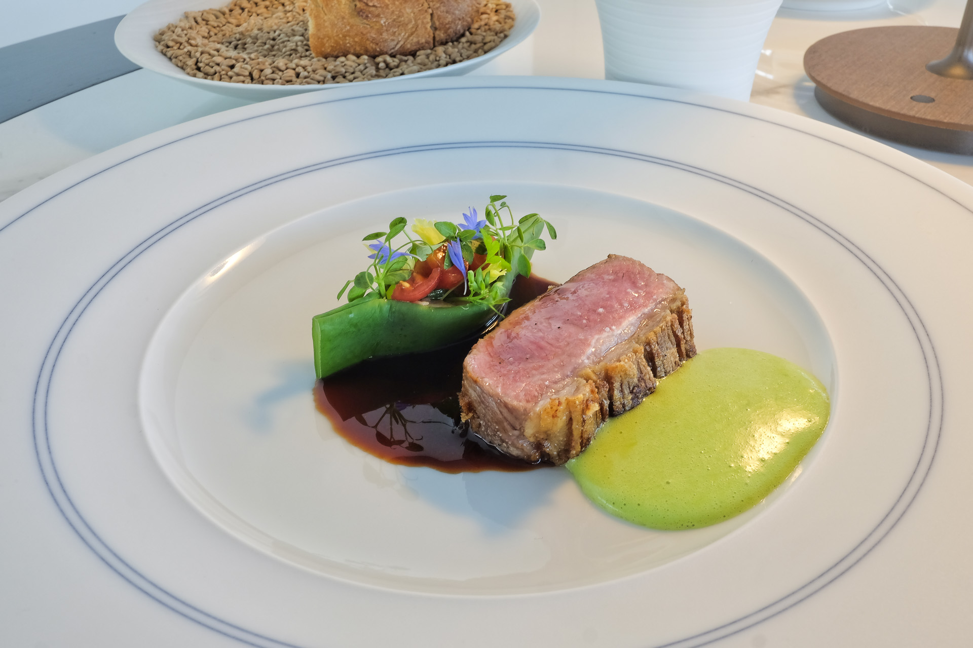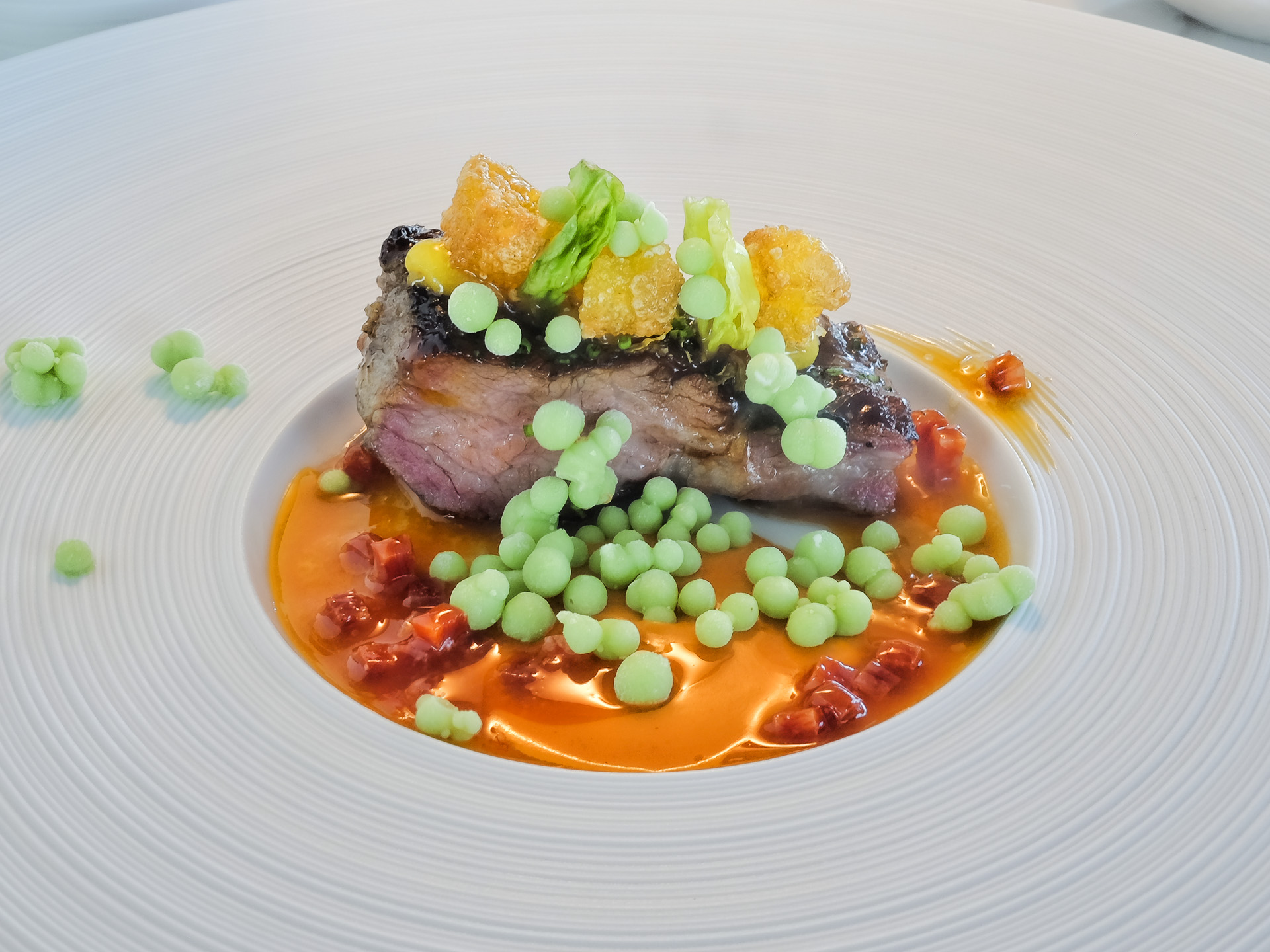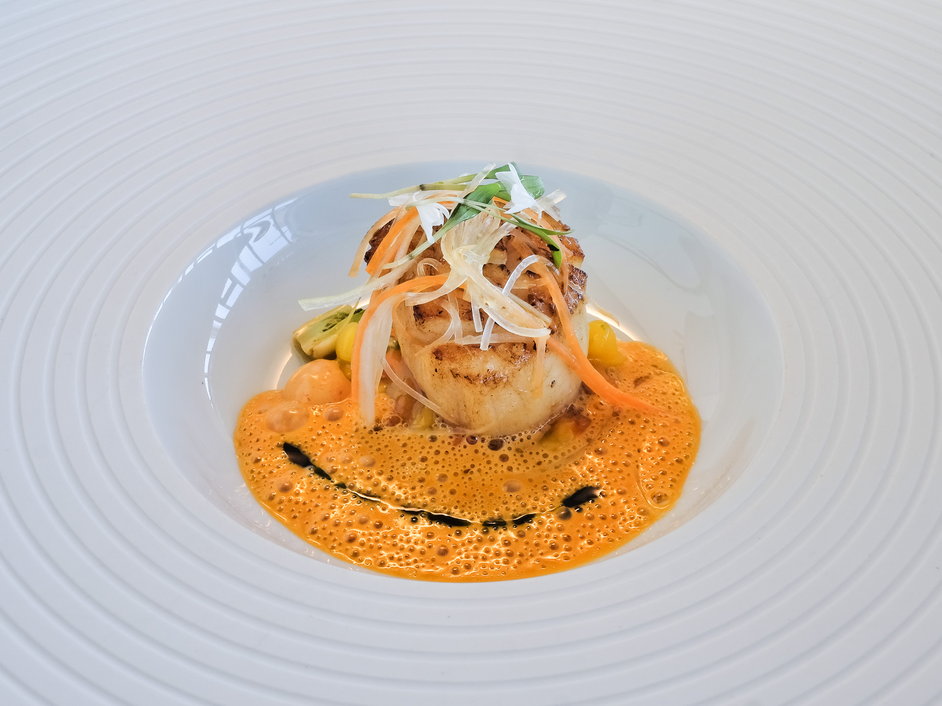 Die norwegische Jakobsmuschel war sehr zart und hatte dezente Röstnoten, sie lag auf einem Mango Karotten Salat. Dazu gab ein eine Art Thai Bouillabaisse mit feinen asiatischen Aromen und einem Hauch Schärfe. Die leicht knackigen Karotten bildeten einen schönen Kontrast zur weichen Mango. Sehr lecker.
