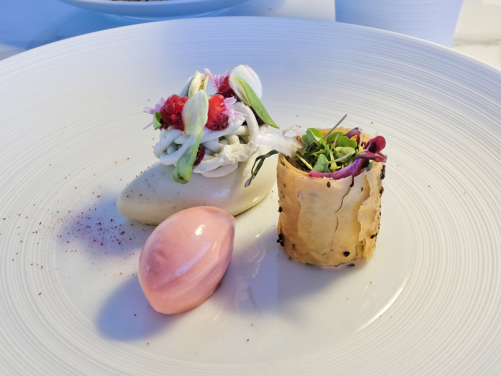 Eine Nocke aus einer Roquefort Mousse war mit etwas Rhabarber gefüllt, bedeckt war sie mit einer Roquefortcreme in Form von Spaghettieis und Himbeerstückchen. Dazu gab es ein Rhabarber Eis und einen Radicchio Salat in einem sehr dünnen sehr krossen Filoteig Röllchen. Der Roquefort vom Affineur Bernard Antony war schön aromatisch. Eine schöne Kombination, sehr lecker, Klasse.