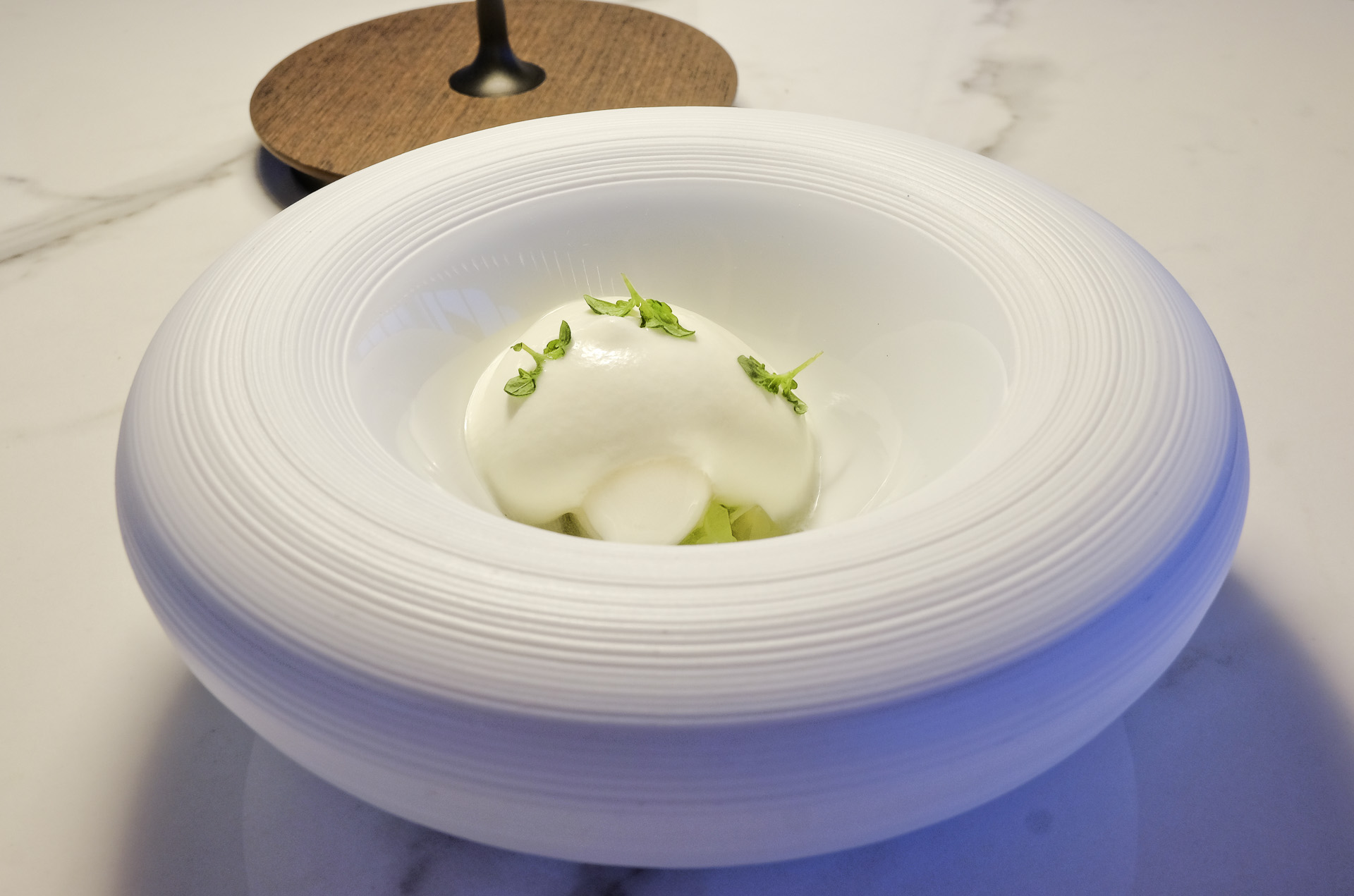 Das Iberico Pluma war schön marmoriert, zart und aromatisch, bedeckt war es mit kleinen Patata Bravas. Dazu gab es eine Chorizo Vinaigrette und geeiste Perlen aus grüner Paprika. Die Chorizo Vinaigrette war schön aromatisch und hatte eine feine Schärfe, das Paprika Eis passte gut dazu. Sehr lecker.