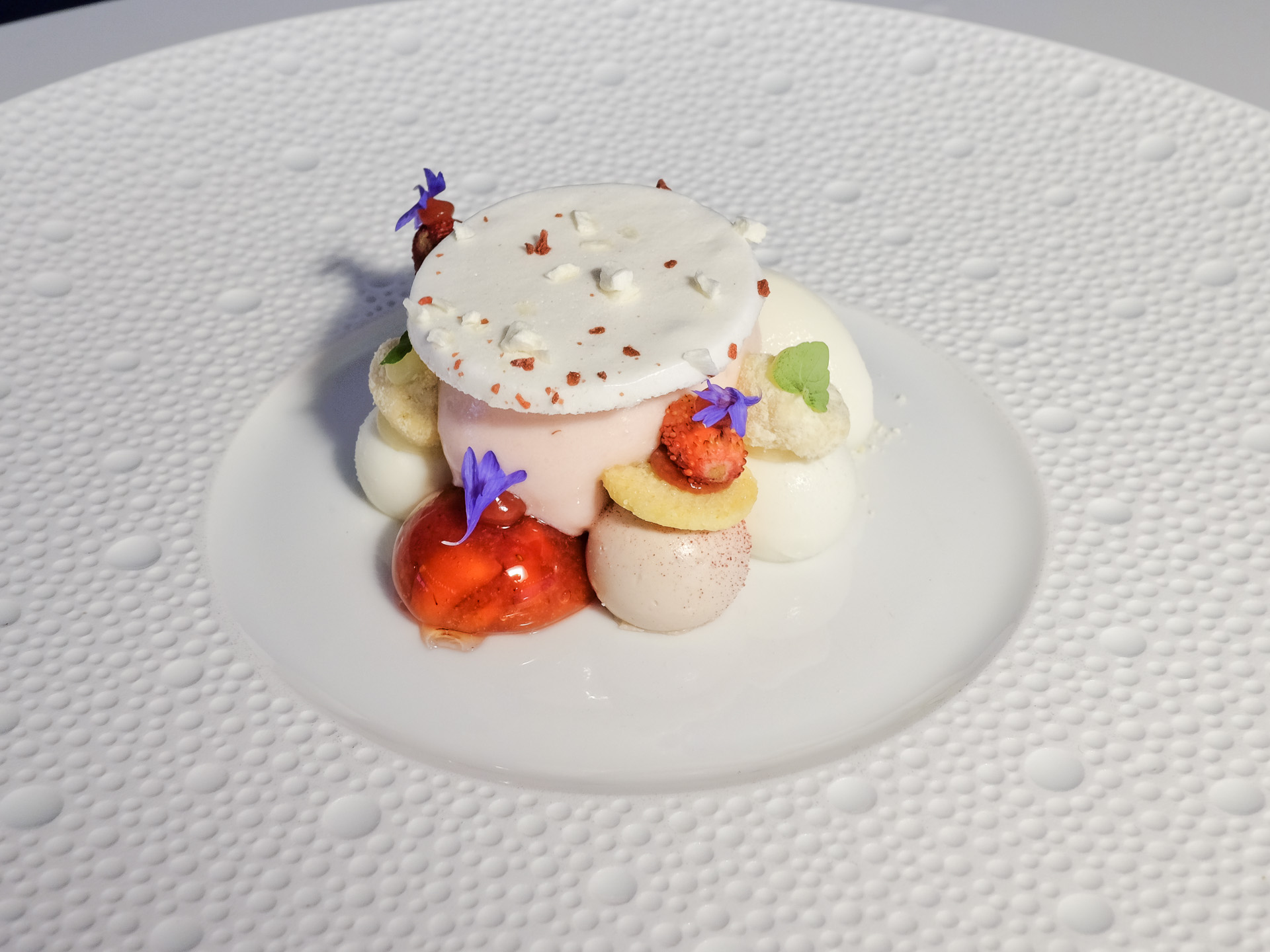 Als Dessert gab es Variationen von Erdbeere und weißer Schokolade, als Creme, Mousse, Eis. Dazu gab es ein Joghurt Holunderblüten Eis, kleine Walderdbeere und einen Baisertaler. Ein schönes Dessert, frisch, fruchtig, fein säuerlich mit unterschiedlichen Textur und Temperaturen. Sehr lecker, Klasse.