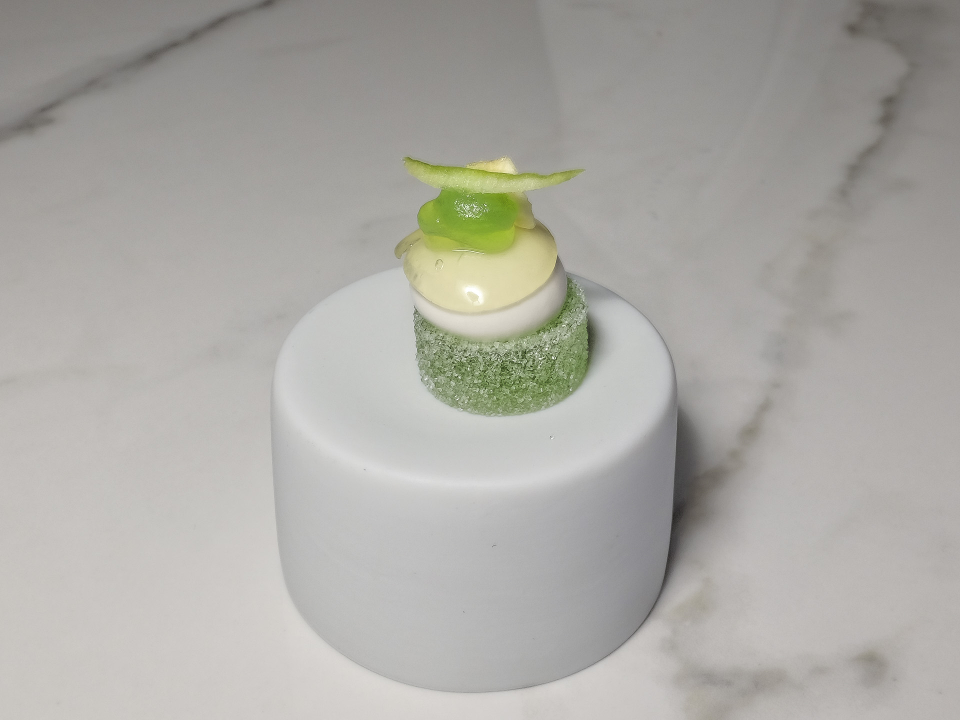 Ein Apfel Gelee mit einem Marshmallow. Es hatte eine zarte Textur und ein feines Aroma. Sehr lecker, Klasse.