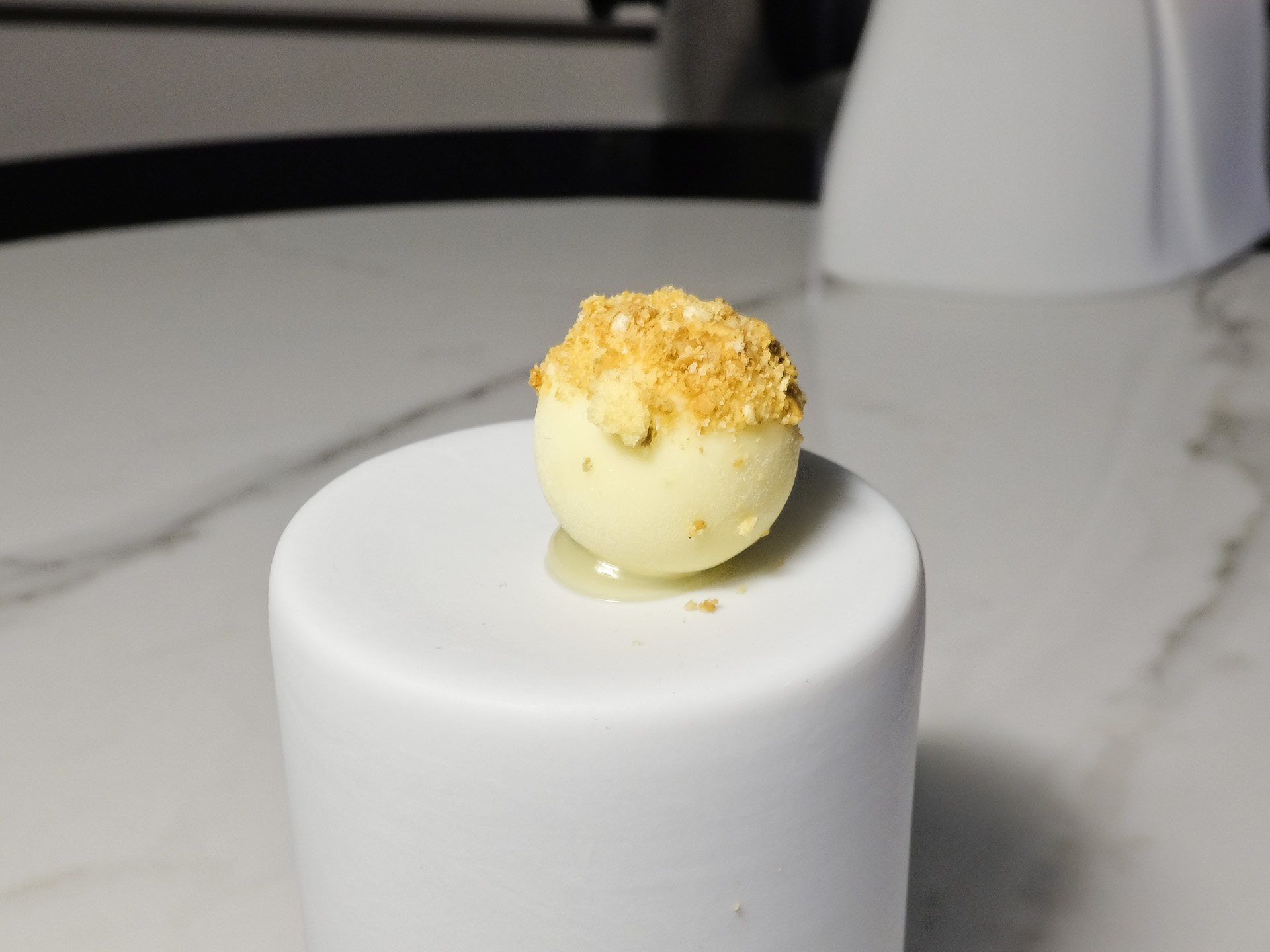 Eine Praline aus weißer Schokolade, gefüllt mit einem Amalfi Zitronen Eis. Sehr lecker.