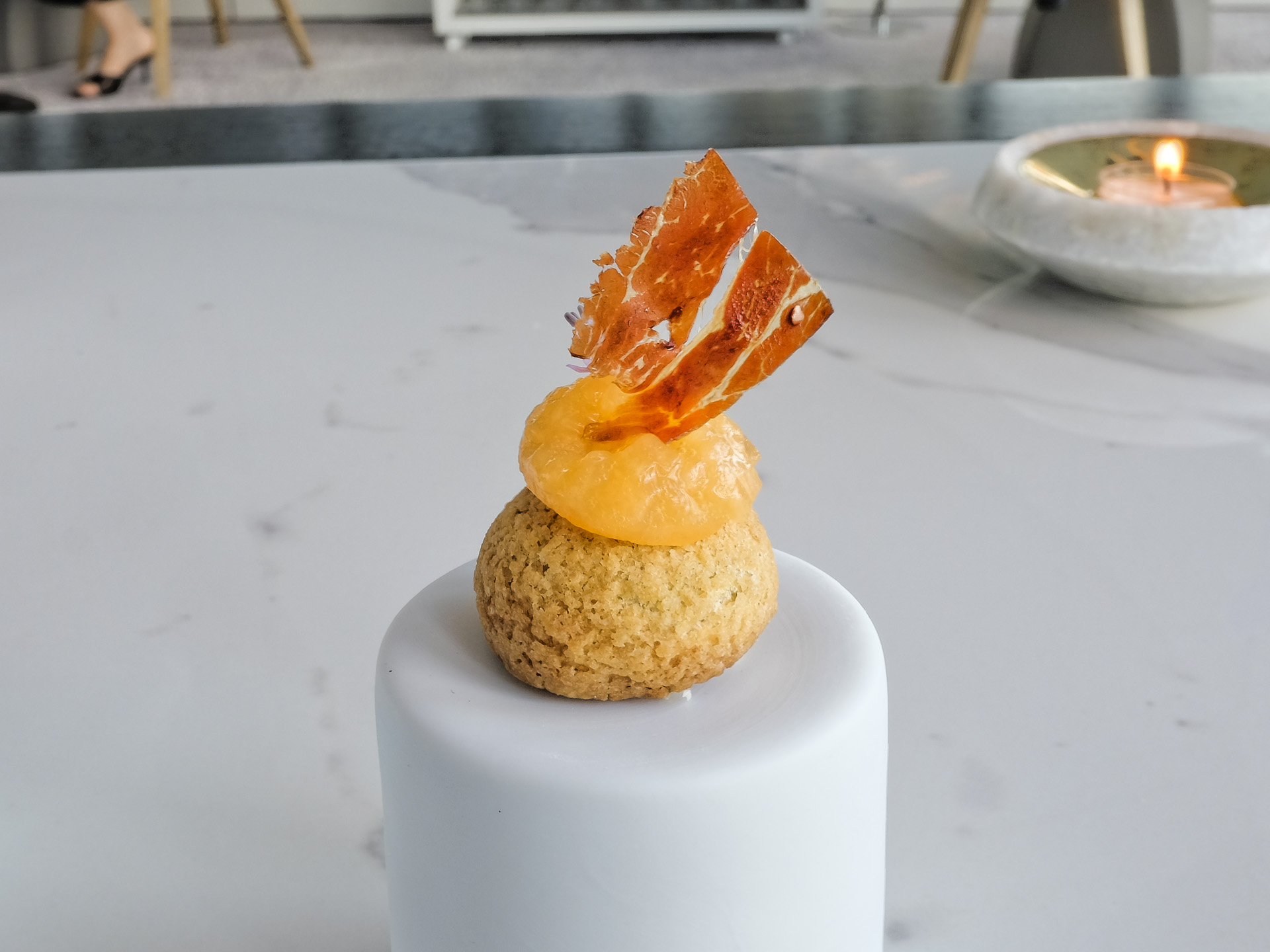 Ein kleiner Windbeutel mit Pesto und einem Pata Negra Chip. Zart mit feinem Aroma, sehr lecker, Klasse.