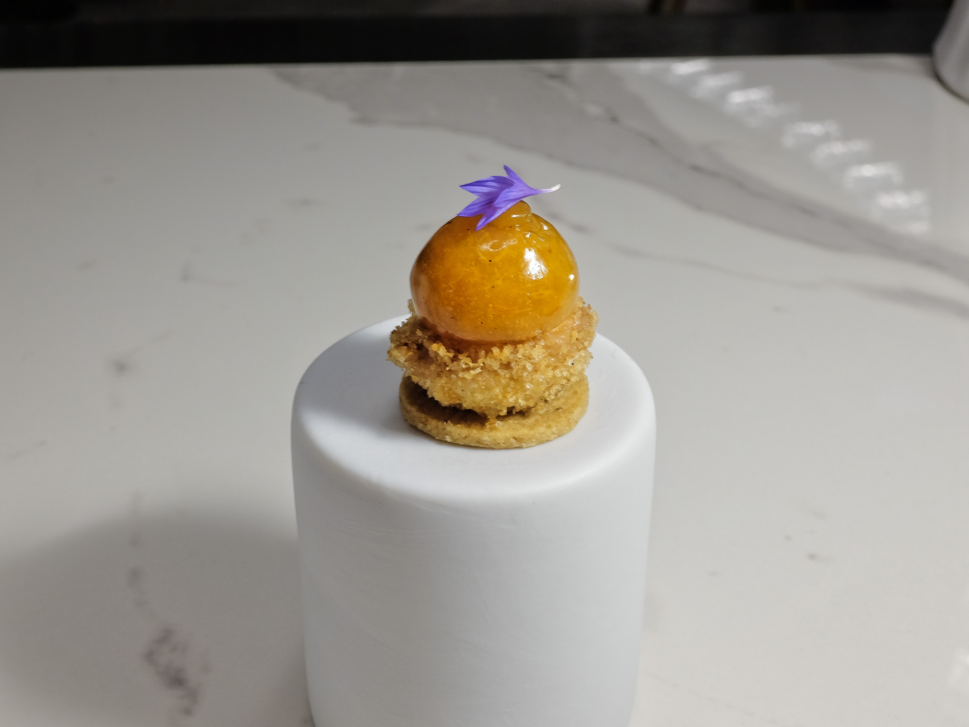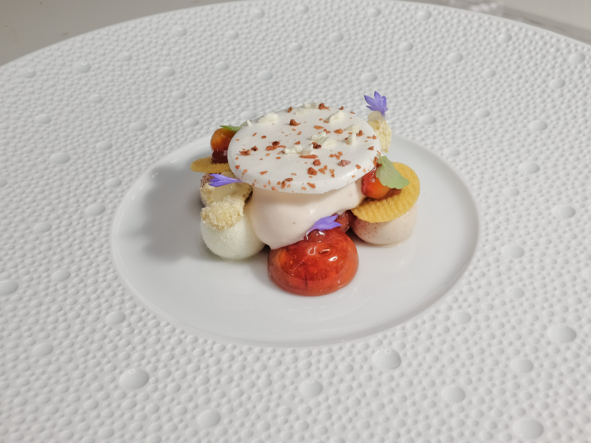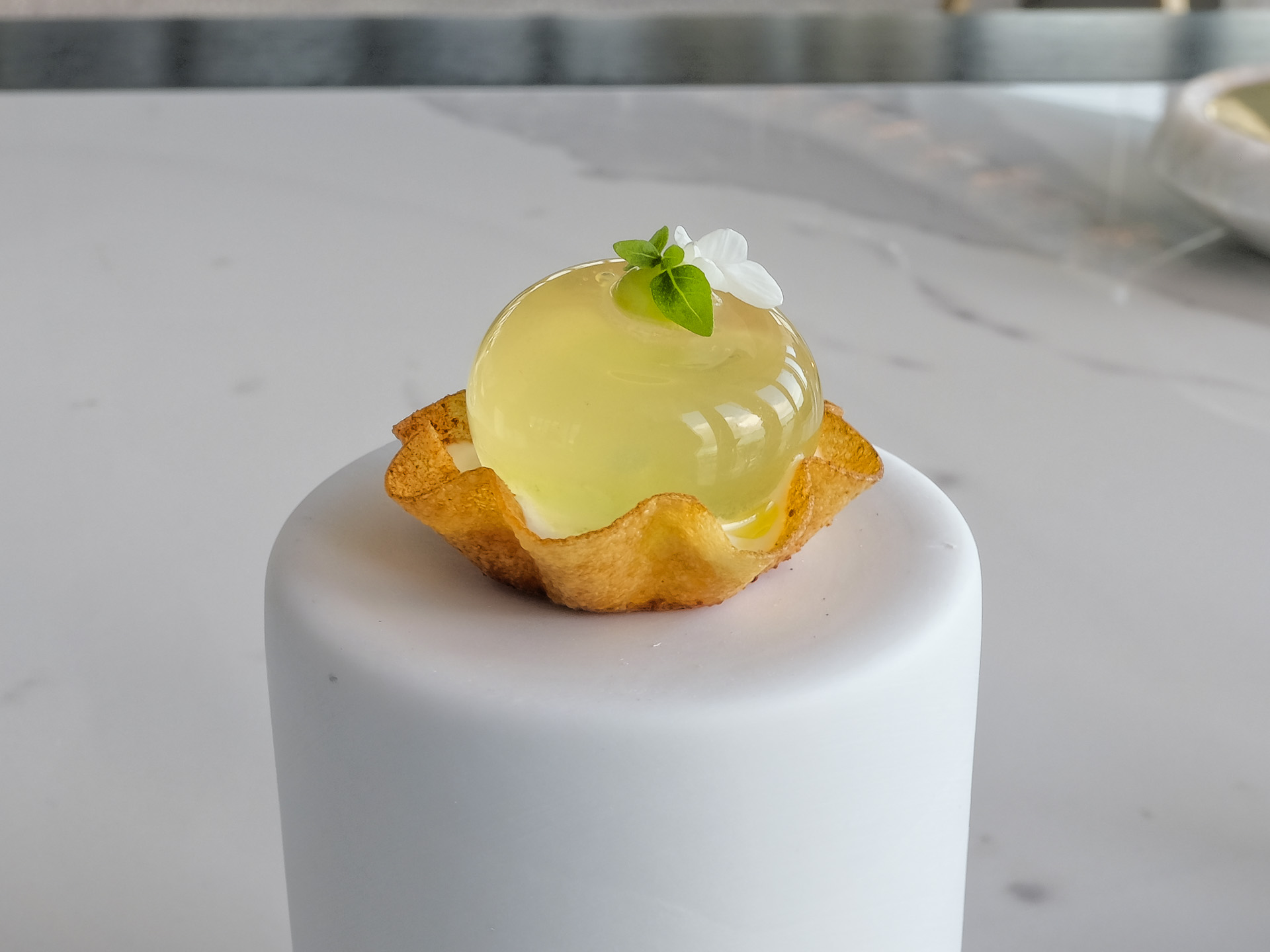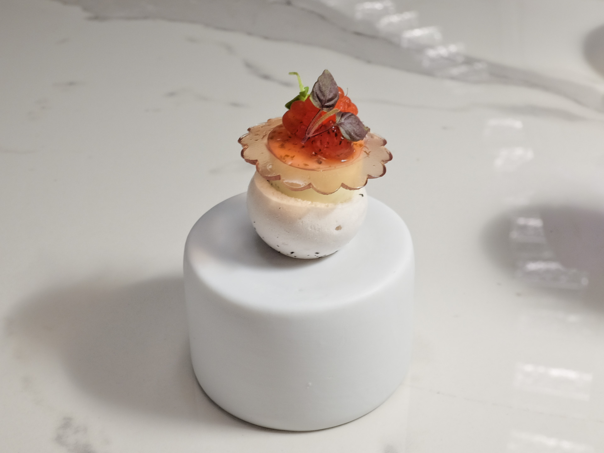 Ein Tartelette mit einer Gazpacho Sphäre. Es hatte ein feines Aroma, sehr lecker.