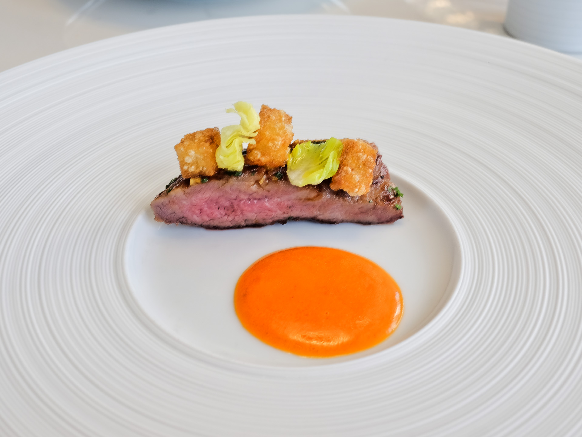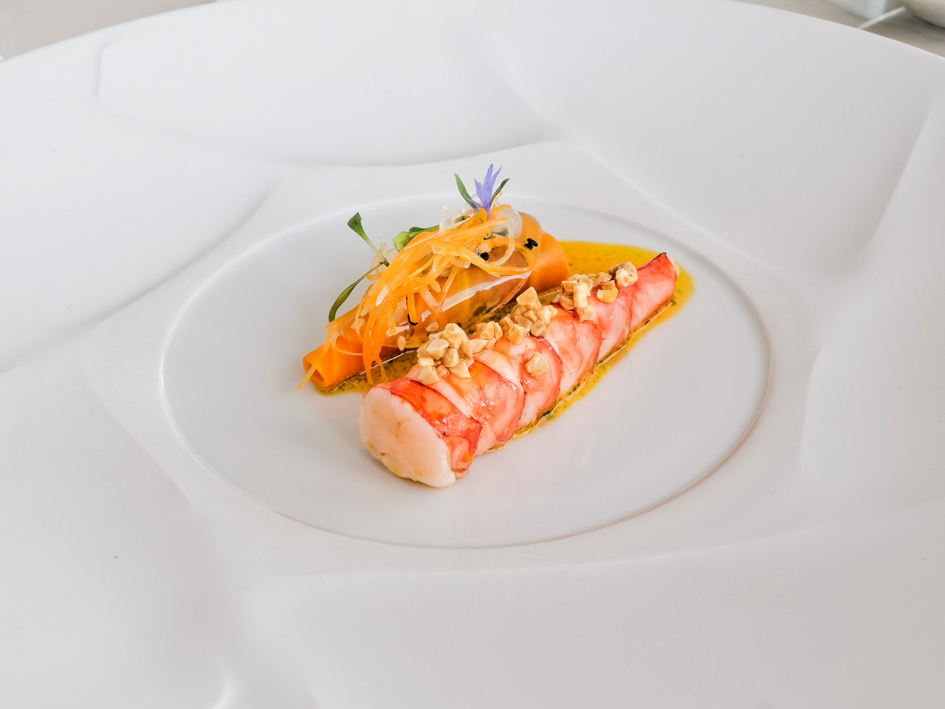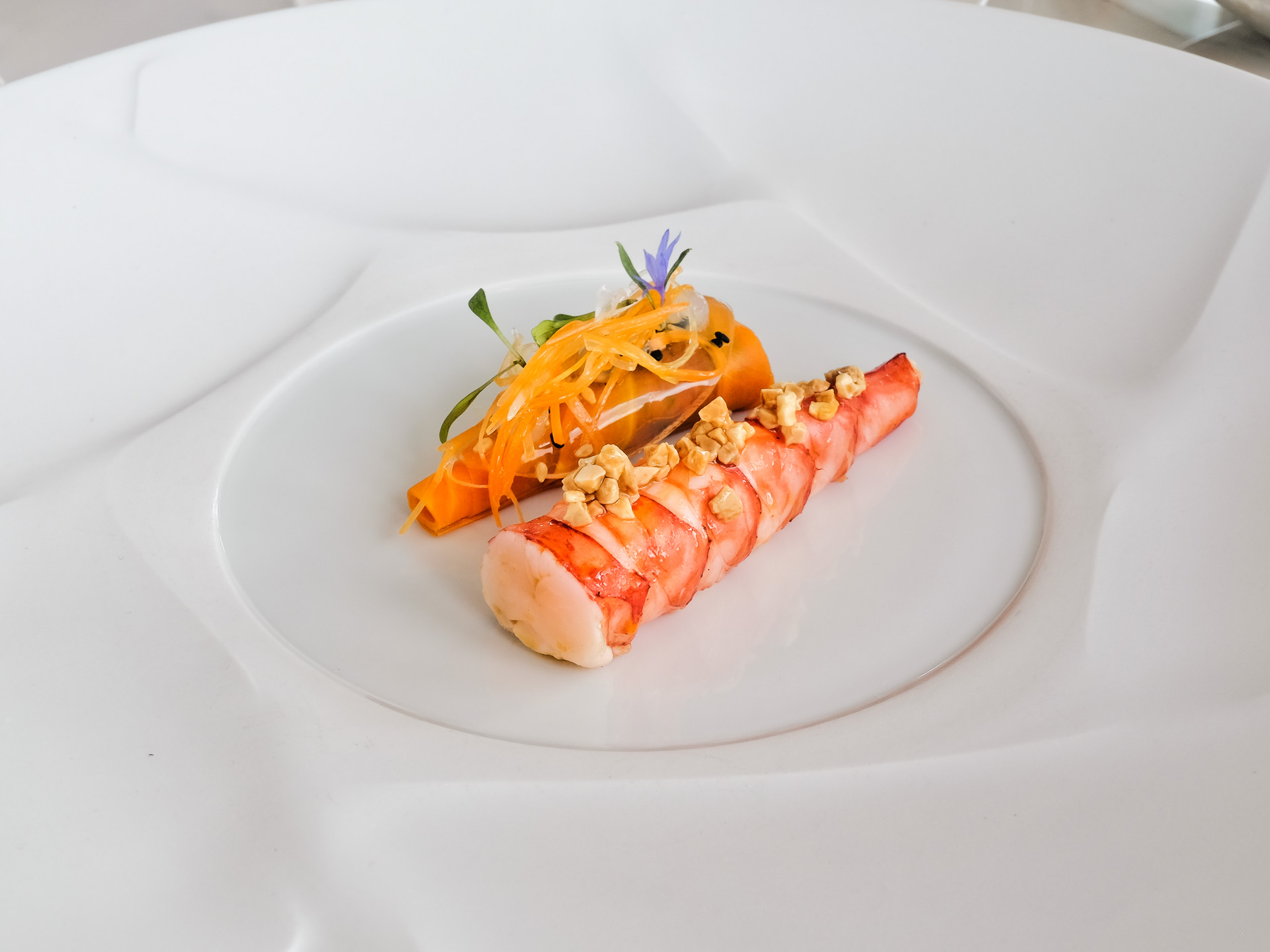 Die Wildgarnele war perfekt gegart, zart, aromatisch mit feiner Textur, bedeckt war mit ein paar Mandelstücken. Dazu gab es eine Karotten die mit Tomate und Papaya gefüllt war. Angegossen wurde eine Krustentier Sauce mit etwas Basilikum Öl. Die Papaya gab dem Gericht eine leicht exotisch fruchtige Note. Sehr lecker, Klasse.