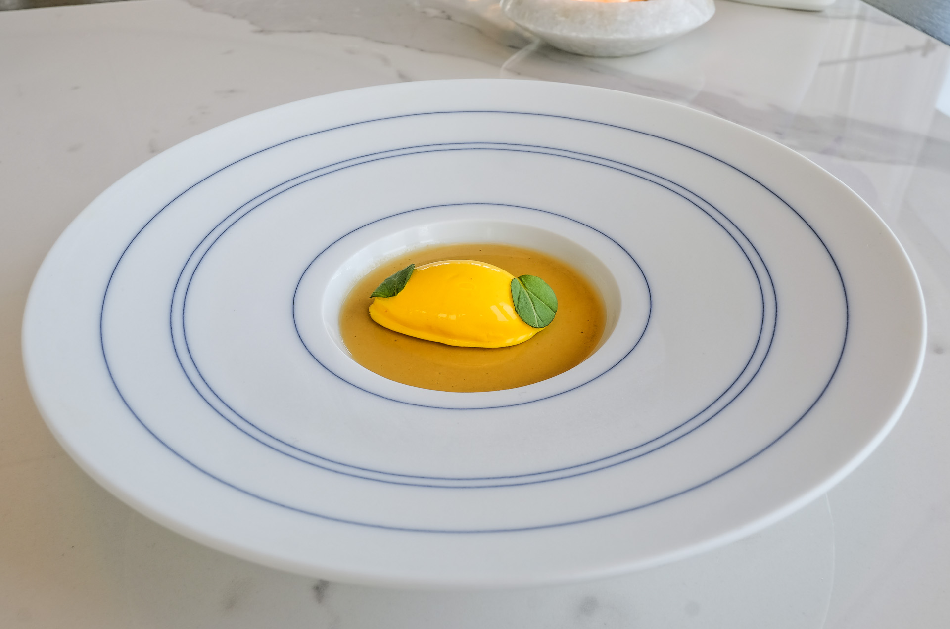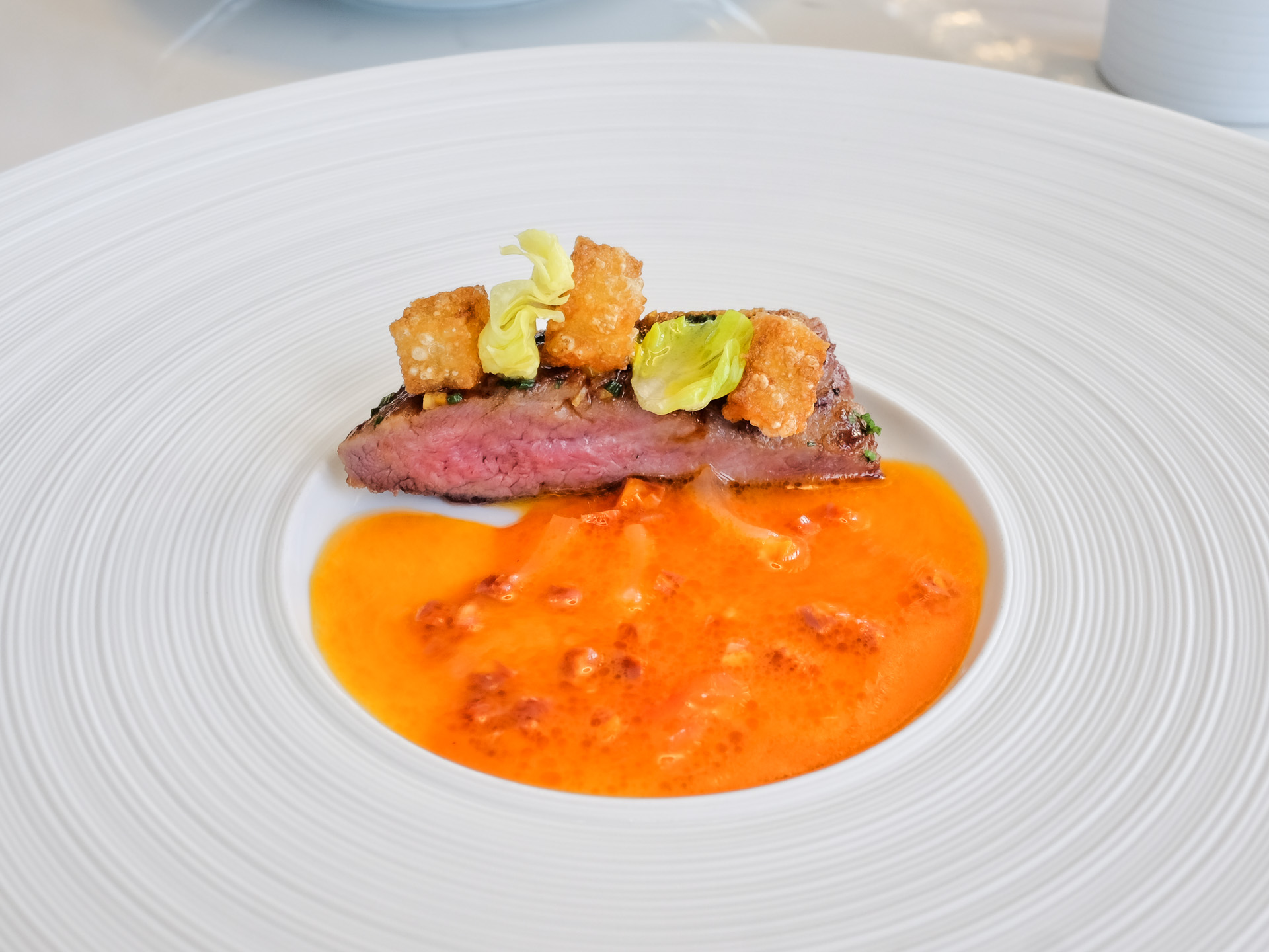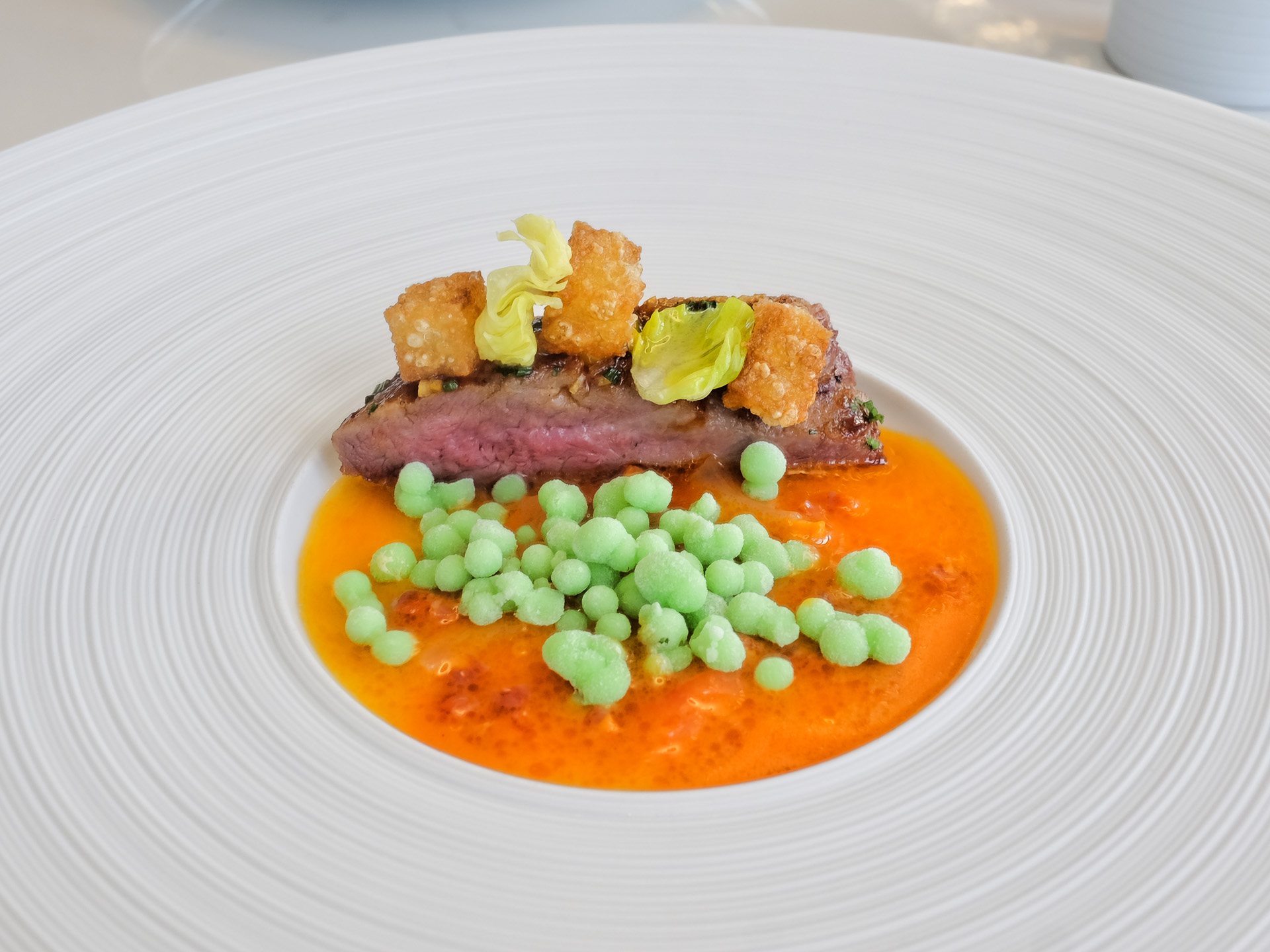 Die Wildgarnele war perfekt gegart, zart, aromatisch mit feiner Textur, bedeckt war mit ein paar Mandelstücken. Dazu gab es eine Karotten die mit Tomate und Papaya gefüllt war. Angegossen wurde eine Krustentier Sauce mit etwas Basilikum Öl. Die Papaya gab dem Gericht eine leicht exotisch fruchtige Note. Sehr lecker, Klasse.