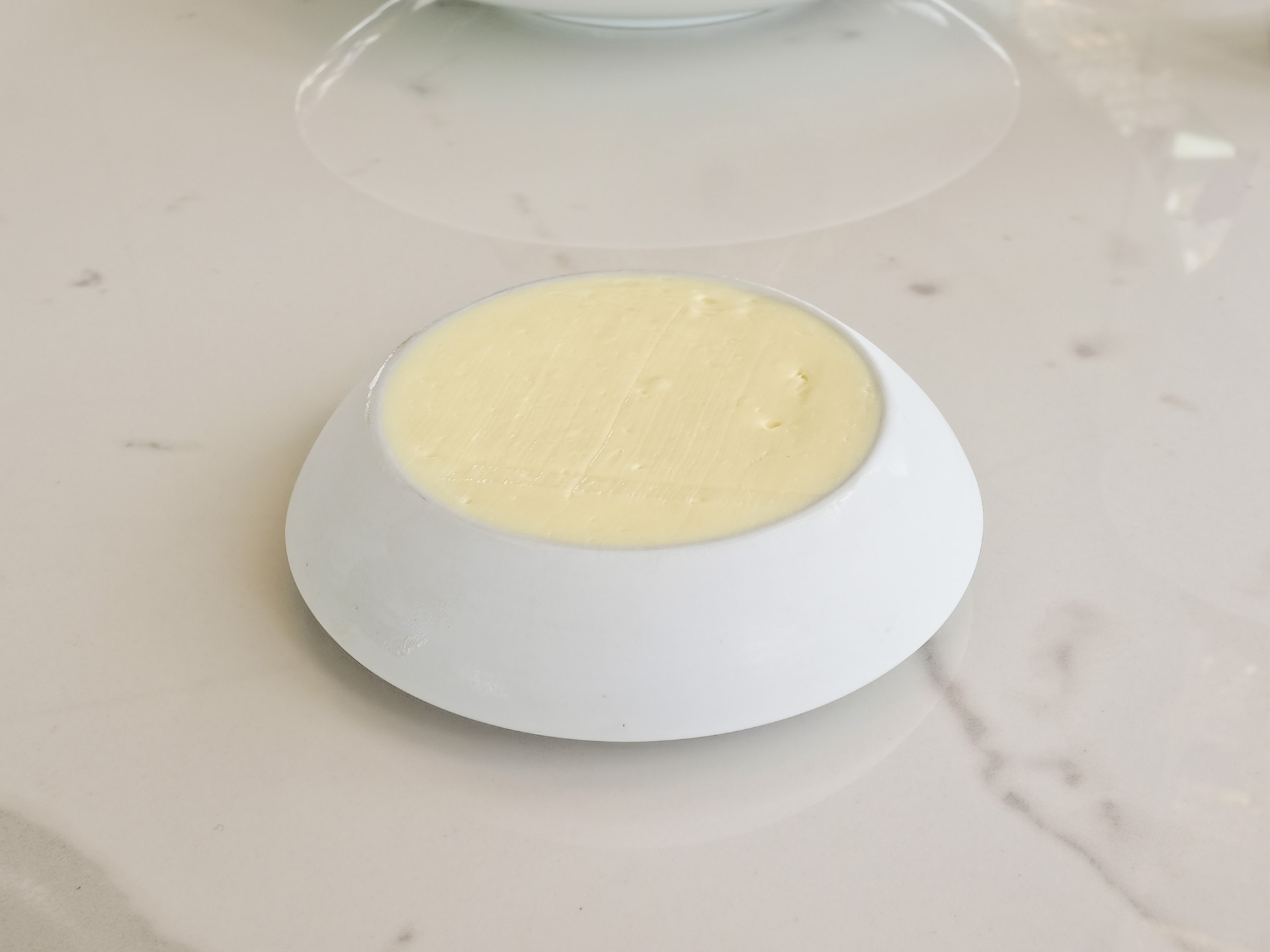Als letzes Amuse Gueules gab es ein Gänseleber Mousse auf kleinen Ananaswürfeln und einem Safran Eis. Das Mousse hatte ein feines Aroma, die Ananaswürfeln gaben dem Gericht fruchtig säuerliche Akzente, das Safran Eis war aromatisch und hatte einen zarten Schmelz. Sehr lecker.