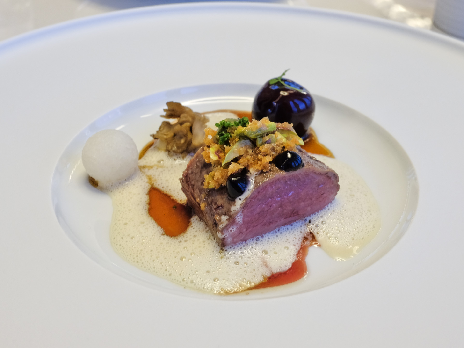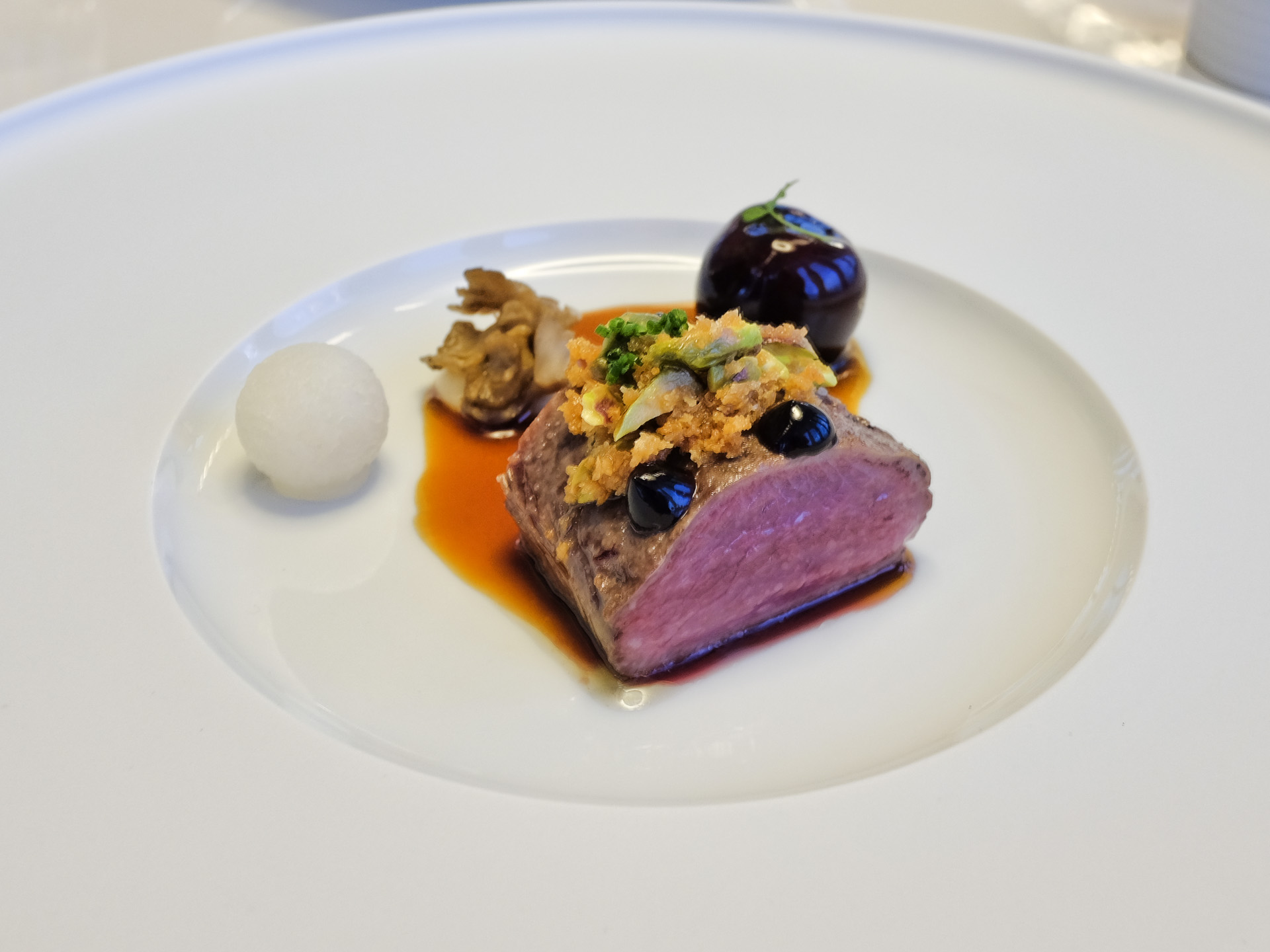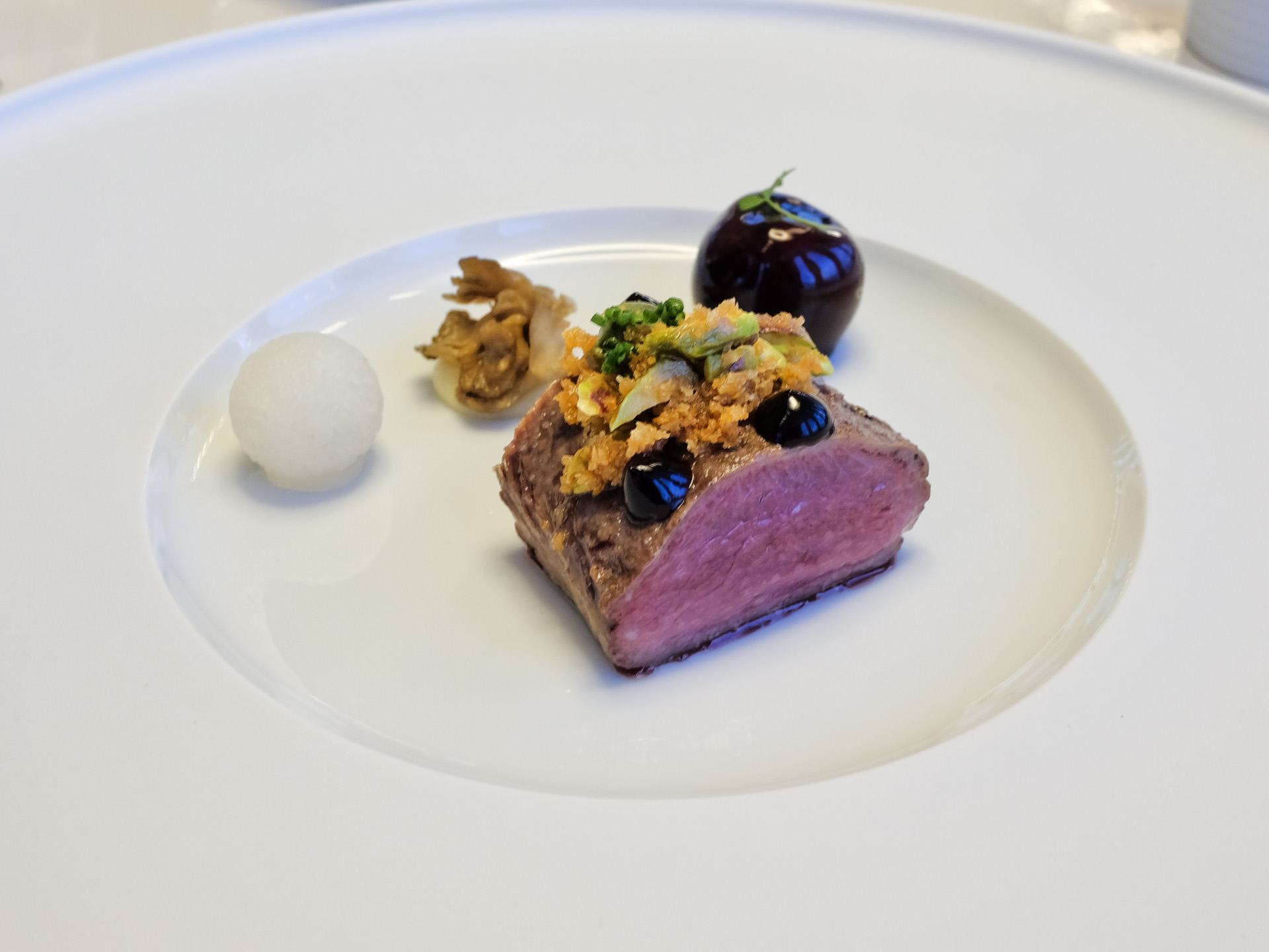 Der Rehrücken war zart, mürbe mit angenehmer Textur und hatte ein feines Aroma, bedeckt war er mit Pistazien. Dazu gab es eine Kugel aus geriebenem Kohlrabi, eine aromatische Kirsche und Maitake Pilze. Angegossen wurde eine aromatische Sauce und einen Sellerie Nussbutter Schaum. Sehr lecker.