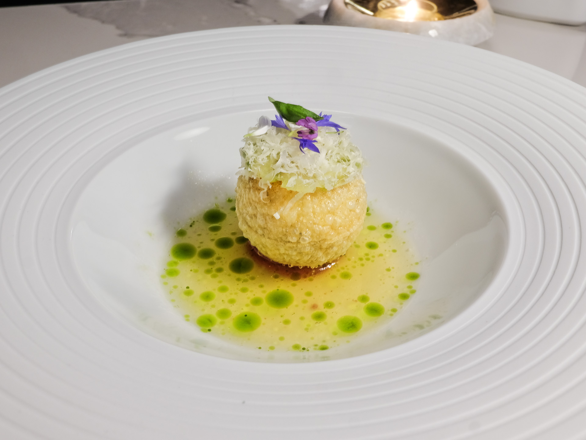 Als Käsegang gab es Parmesan von der Reggiana-Rasse. Die knusprige Kugel war mit einem aromatischem Espuma gefüllt, bedeckt war sie mit etwas geriebenem Parmesan. Dazu gab es etwas mediterranes Gemüse, getrocknete Tomaten und etwas Basilikum Öl. Sehr lecker.