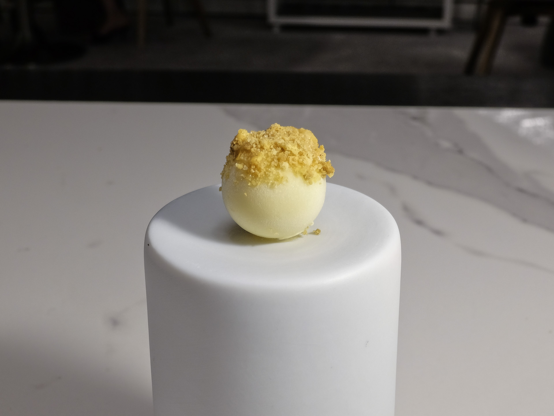 Eine Praline aus weißer Schokolade und einer geeisten Füllung mit Amalfi Zitrone. Sehr lecker.