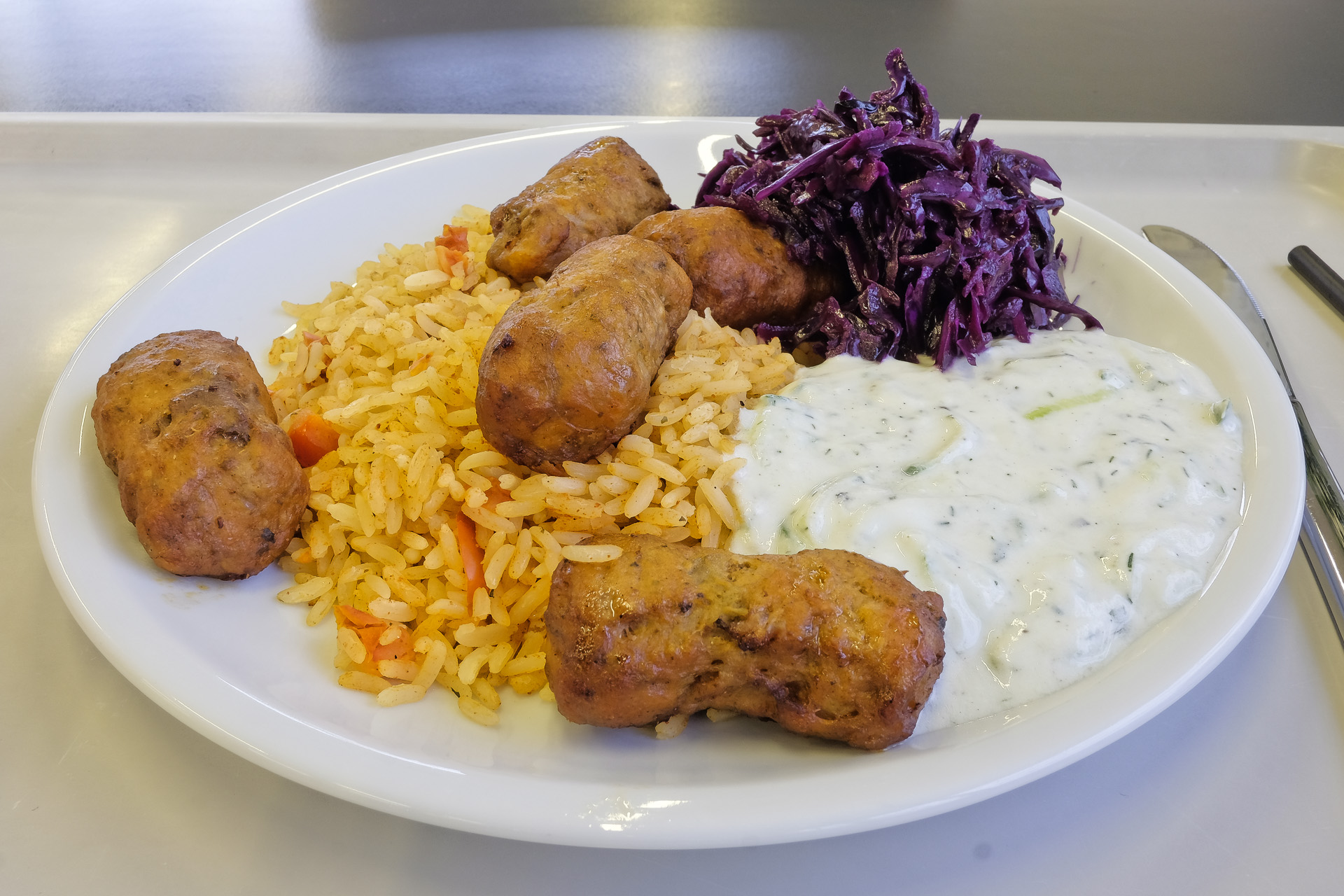 Die Cevapcici waren zart und eher dezent gewürzt. Dazu gab es Reis mit Tomaten, einen Rotkraut Salat und Tzatziki. Das Rotkraut war knackig und hatte einen angenehmen Biß und ein feines Aroma. Das Tzatziki mit Gurken und Dill hatte ein feines Aroma, es hätte aber deutlich mehr Knoblauch enthalten können. Knoblauch ist in einer Mensa natürlich immer ein Kompromiss. Sehr lecker.