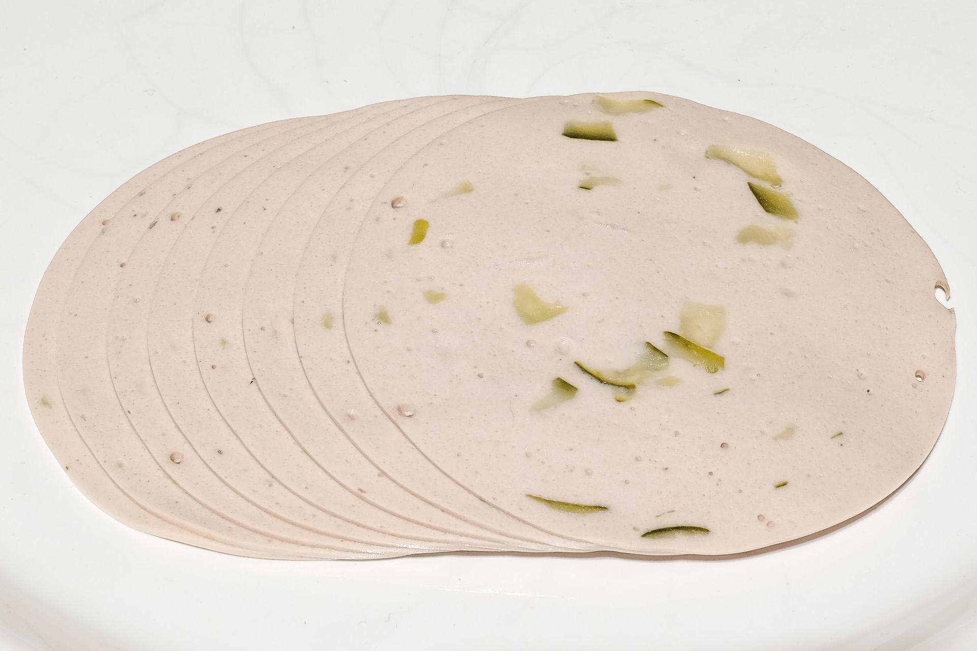 Veganes Erzeugnis nach Art einer Mortadella mit Gurke, auf Basis von Rapsöl, Kartoffel- und Erbsenprotein (Zitat My Vay)
