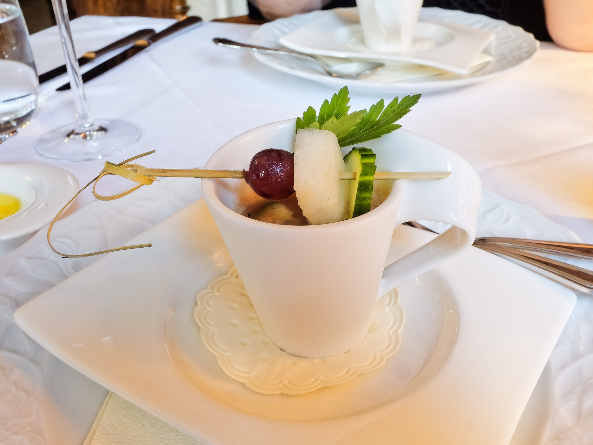 Als Amuse Gueule gab es eine Gurken Melonen Kaltschale mit frischem feinen Aroma und einem Hauch Schärfe. Sehr lecker.