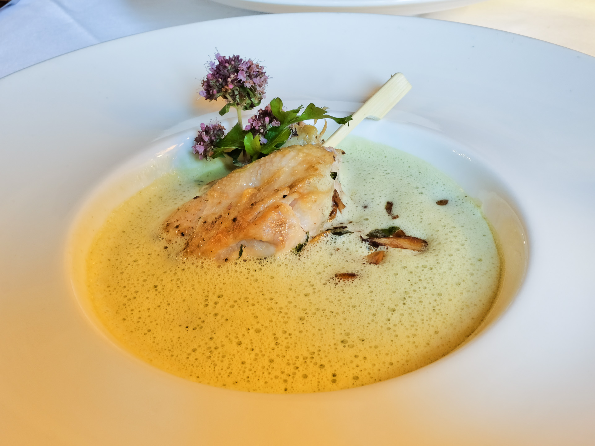 Schaumsüppchen von Erbse-Kokos & Putbuser Bärlauch mit Brust vom Stubenküken und frischen Pfifferlingen