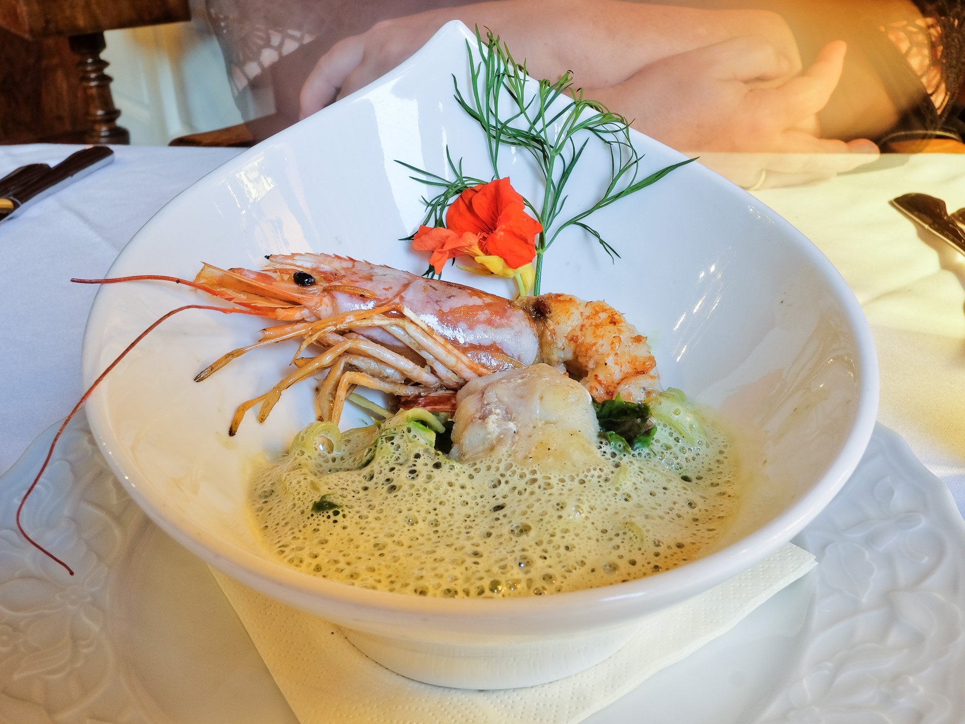 Die Tagliatelle von Kapuzinerkresse waren leicht al dente, dazu gab es Mangold, eine Wildgarnele und ein Seeteufel Bäckchen. Das Seeteufel Bäckchen war zart mit fester Textur und feinem Aroma, die Wildgarnele war leider völlig übergart und mehlig. Gerade noch sehr lecker.