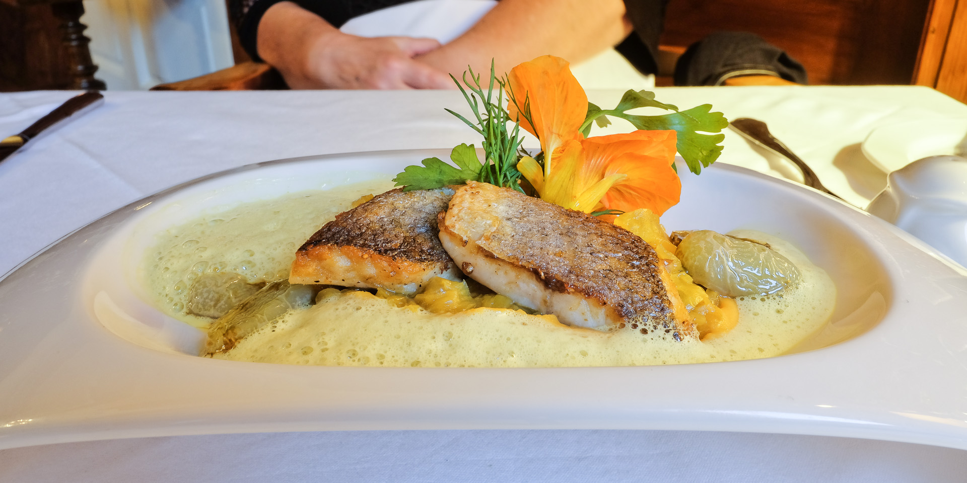Der Loup de mer hatten eine krosse Haut mit leichten Röstnoten und ein feines Aroma. Dazu gab es ein zartes aromatisches Süßkartoffel Püree, grüne Tomaten, Orangen Fenchel und einen dezenten Safran Schaum. Sehr lecker.