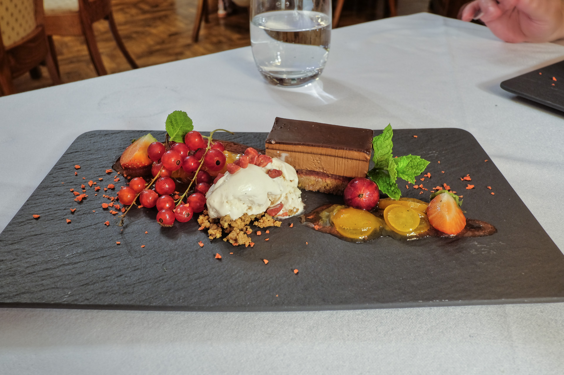 Als Dessert gab es ein Erdbeer Kokos Eis, rote Johannisbeeren, Erdbeeren, eine Stachelbeer, ein Schokoladen Haselnuss Törtchen und ein Bitterorangen (oder Kumquat) Kompott. Die Johannisbeeren waren schön reif und nicht zu sauer. Ein schönes Dessert, sehr lecker.