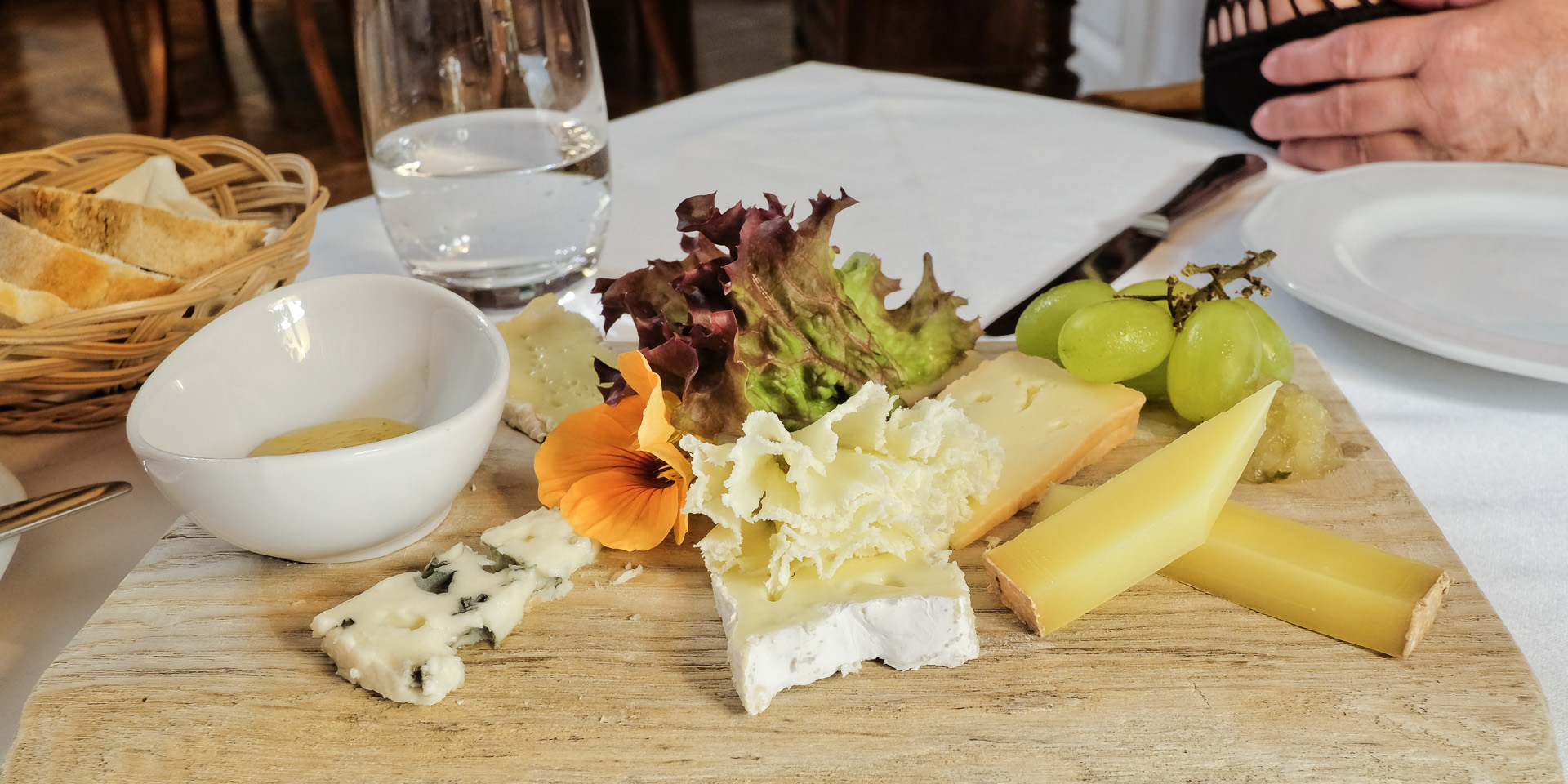 Auswahl französischer Rohmilchkäse mit Feigensenf, Fenchelmarmelade, Trauben & Baguette