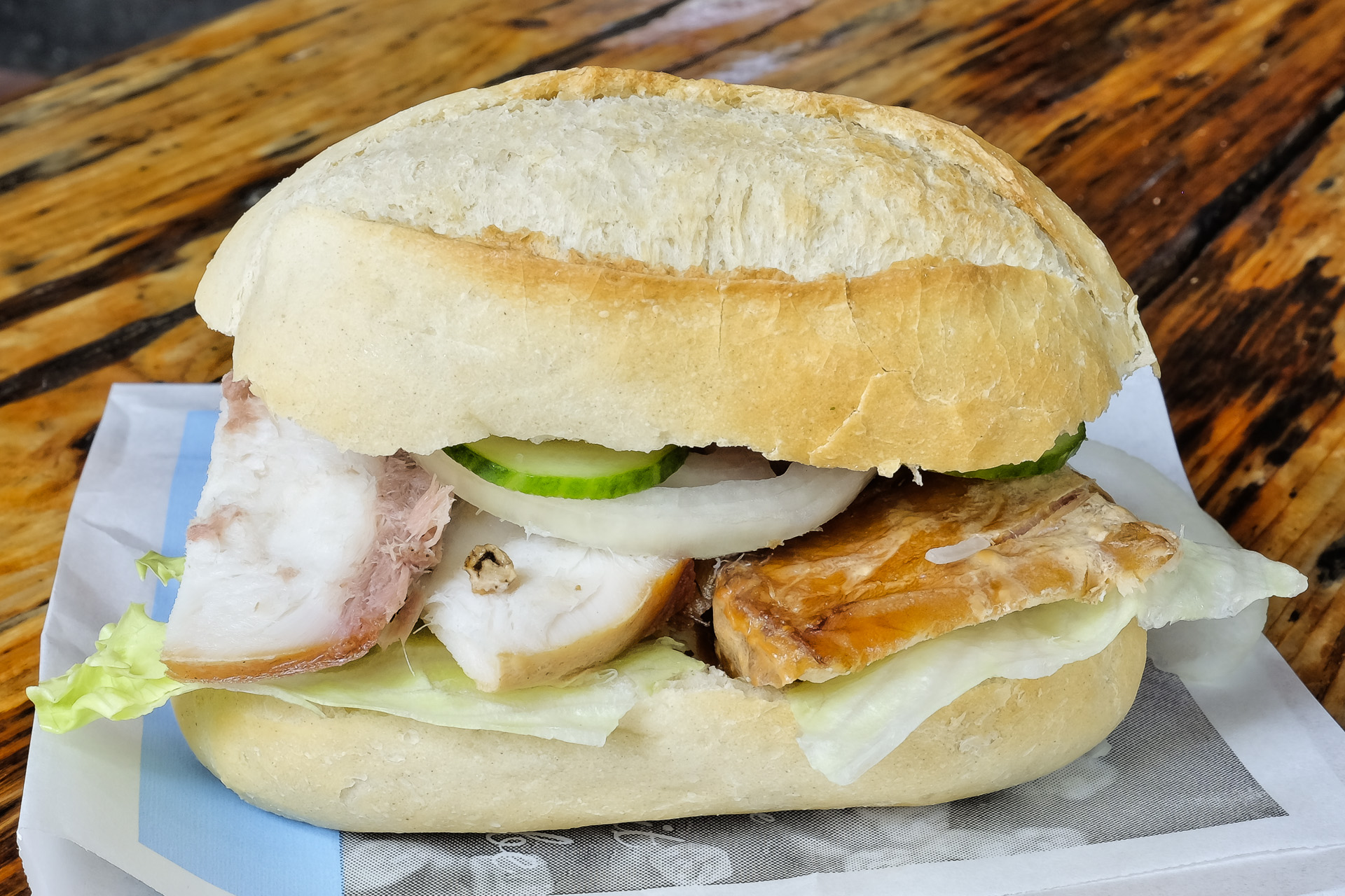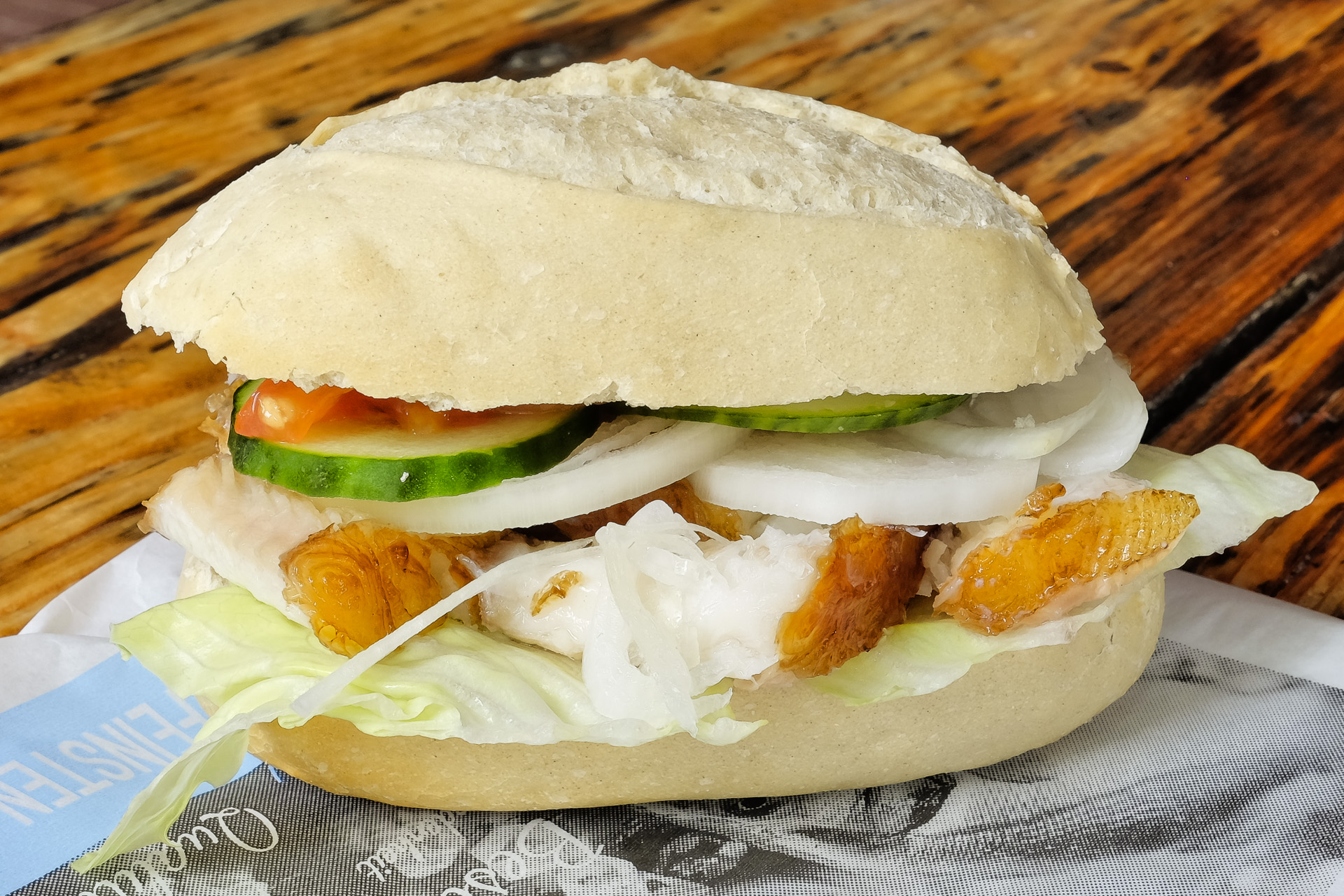 Das Brötchen war mit geräuchertem Heilbutt, Eisbergsalat, Tomate, Gurke und Zwiebeln belegt. Der Heilbutt war sehr zart, saftig und hatte ein feines Aroma mit feiner Rauchnote, das Brötchen hätte etwas knuspriger und lockerer sein können. Sehr lecker.