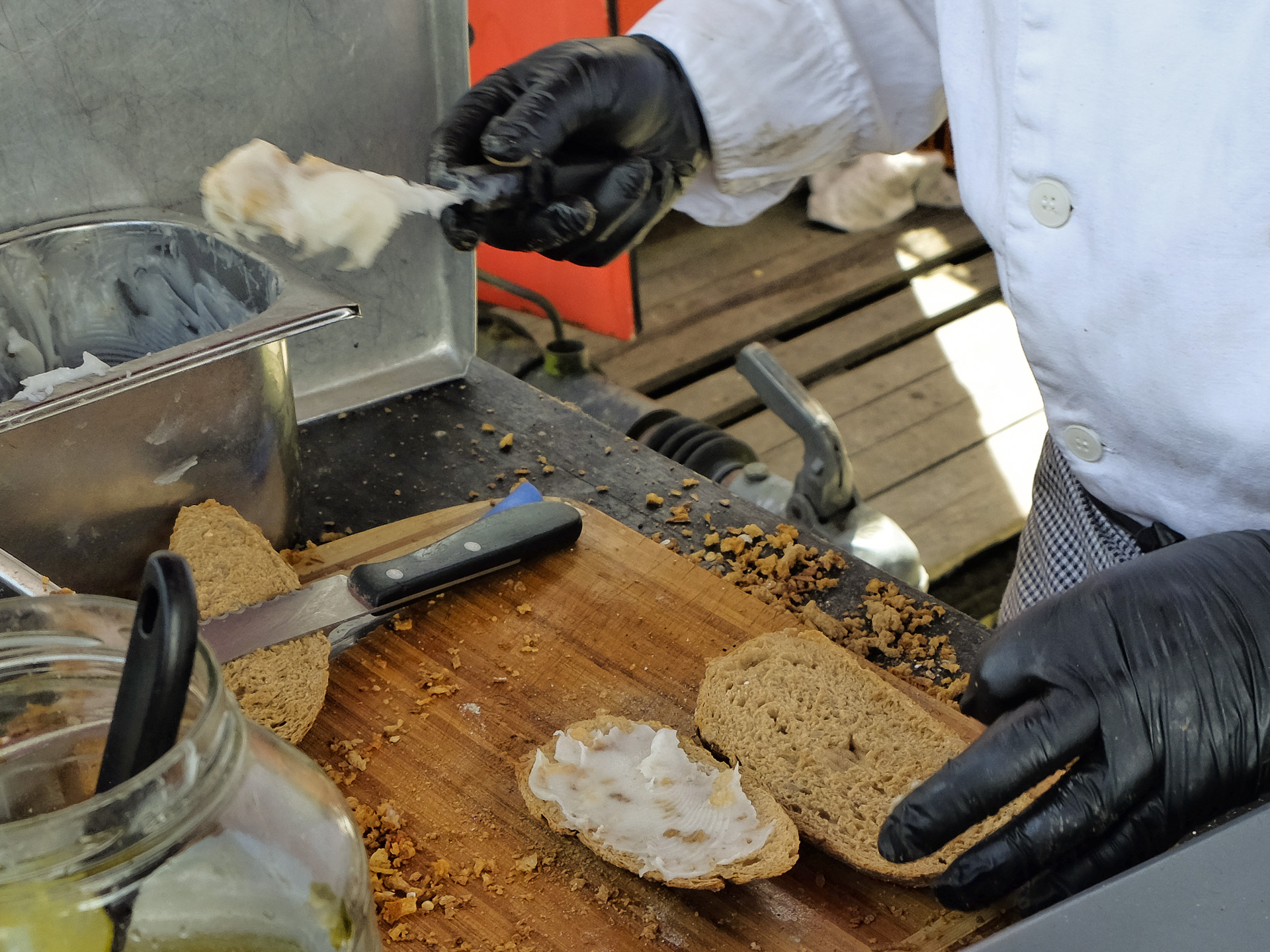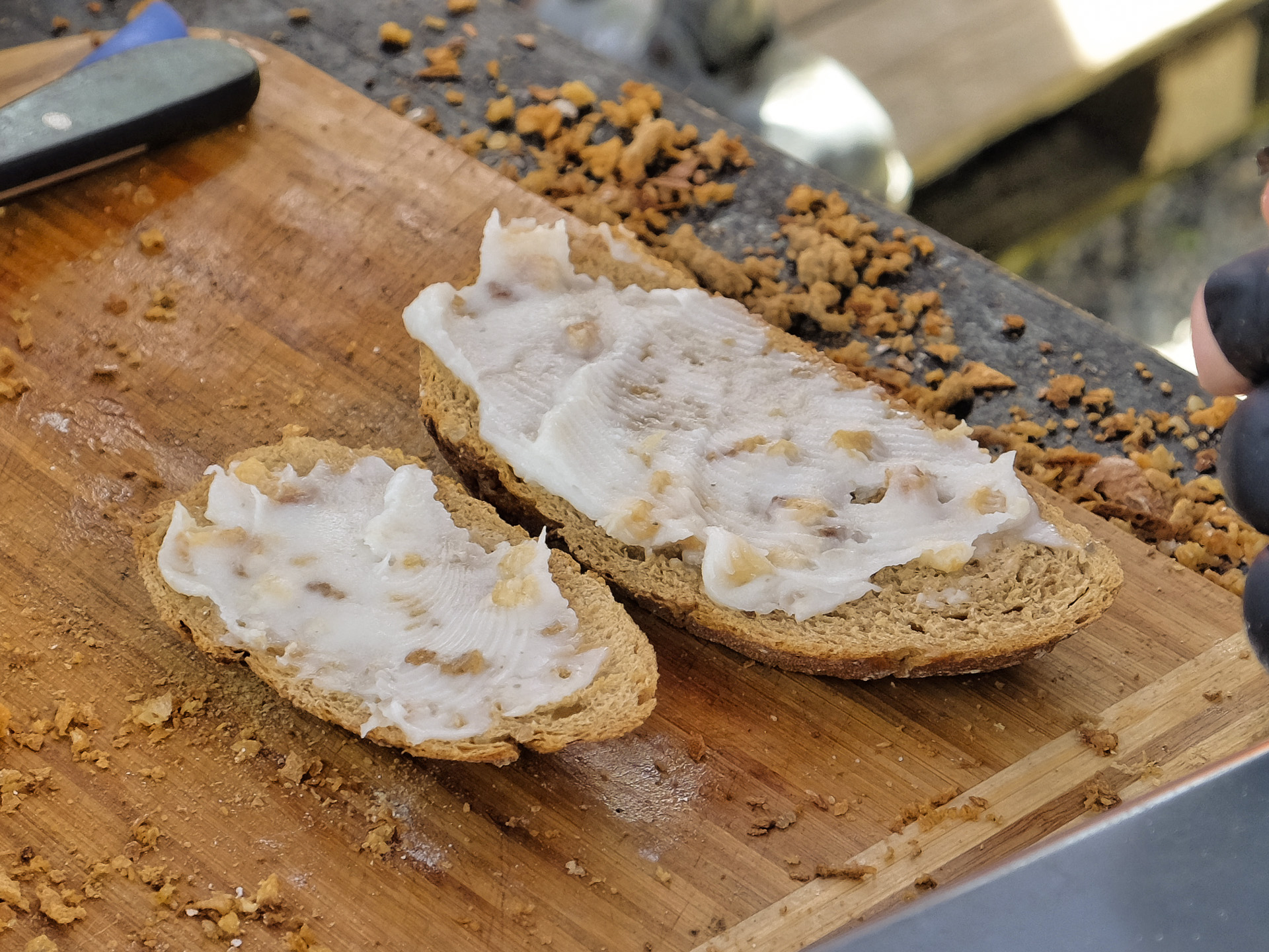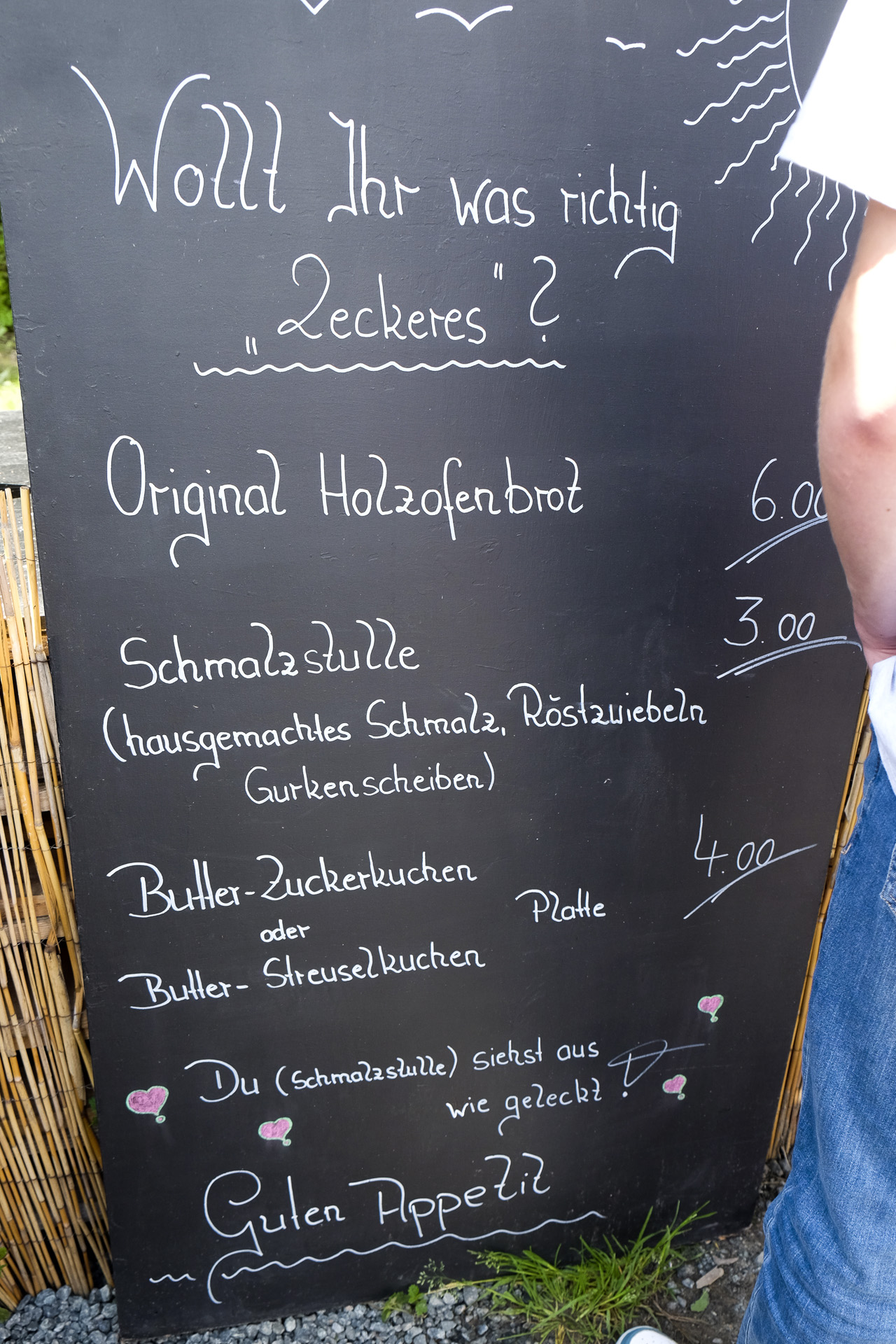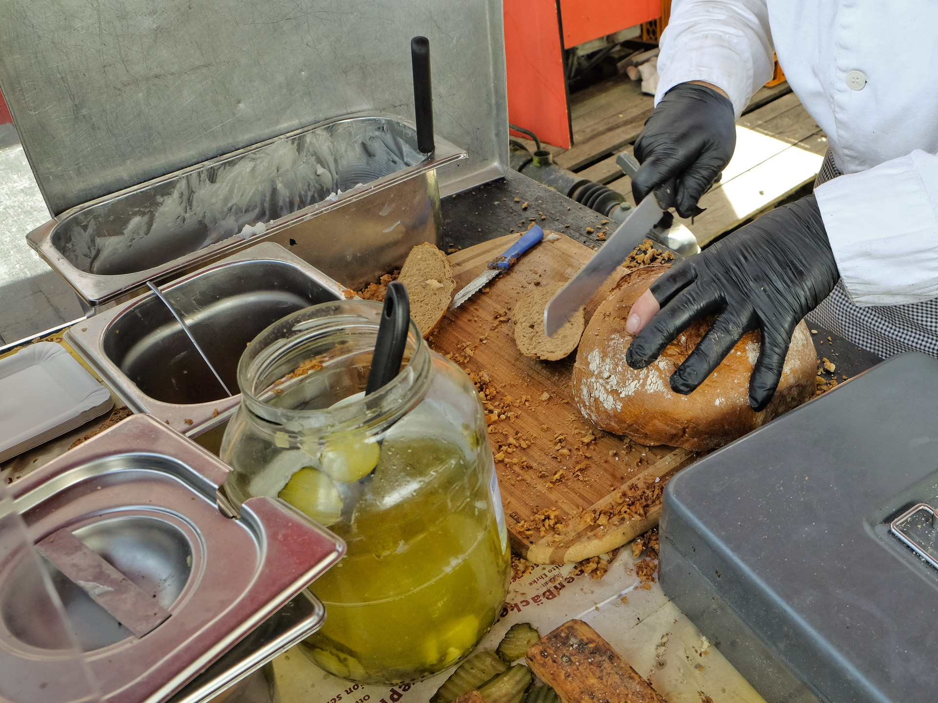 Das Brot hatte eine lockere Krume, das Schmalz hatte ein feines Aroma. Dazu gab es gute Röstzwiebeln und Gewürzgurkenscheiben. Sehr lecker.
