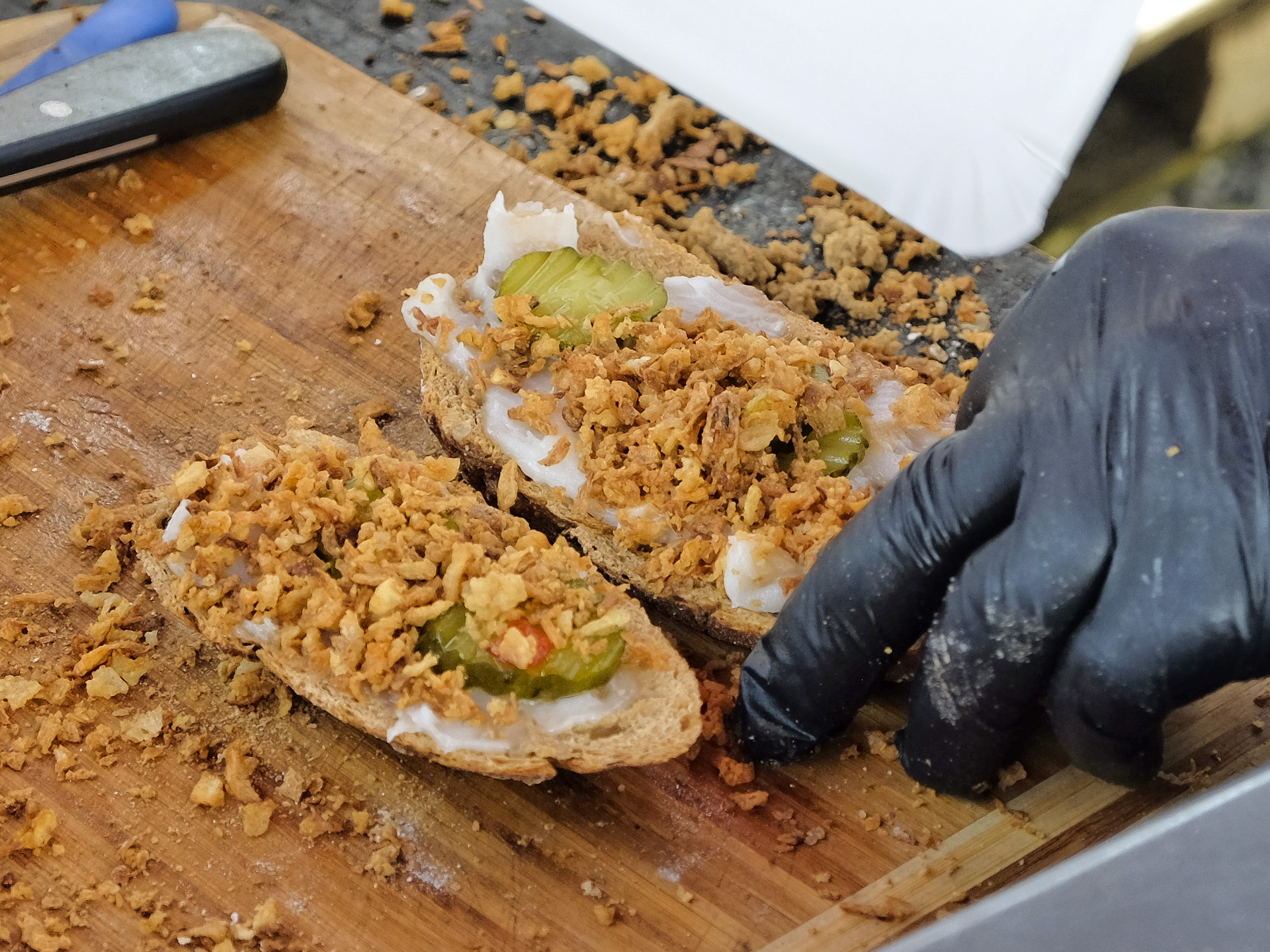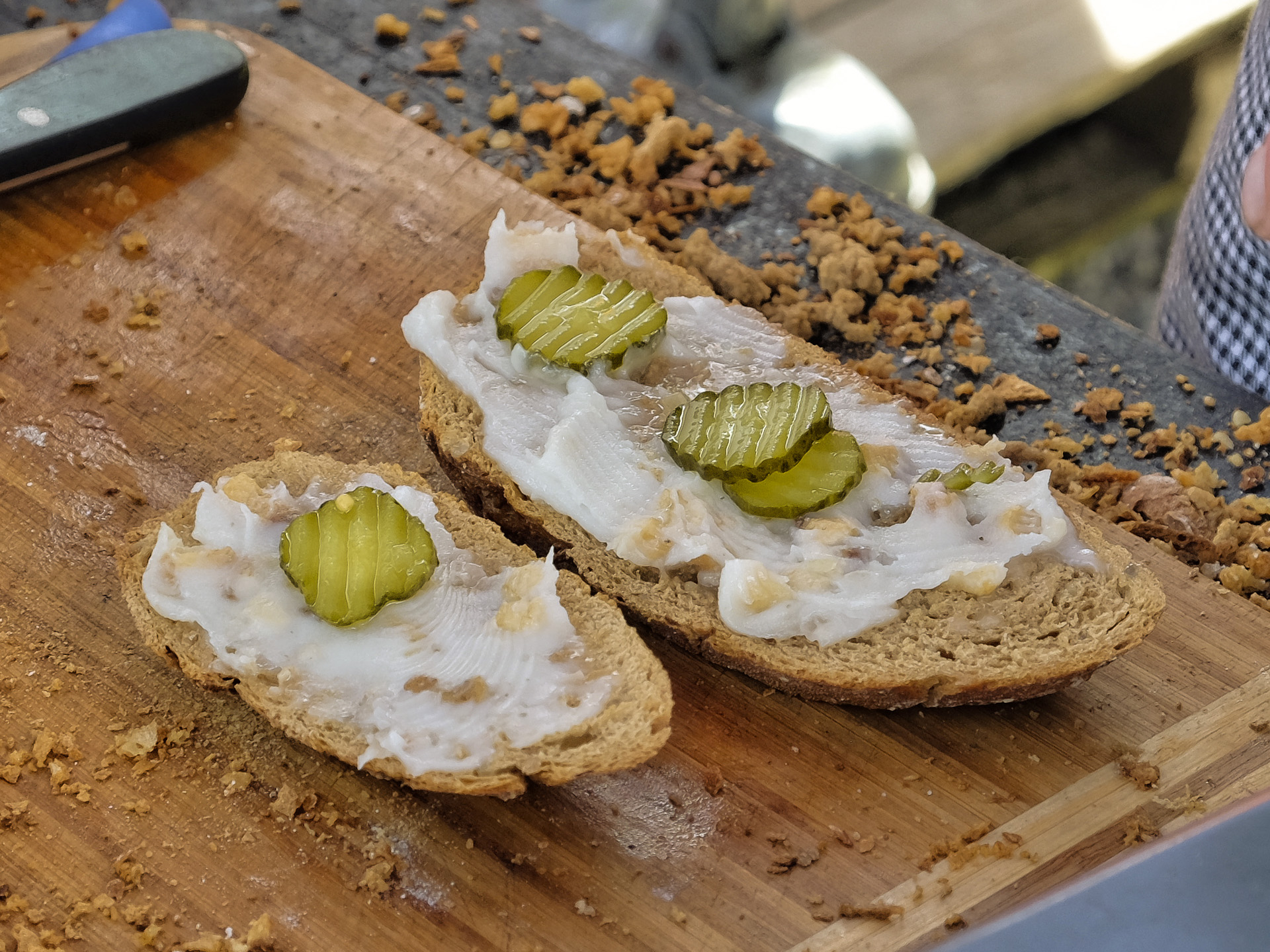 Schmalzstulle mit hausgemachtem Schmalz, Röstzwiebeln und Gurkenscheiben