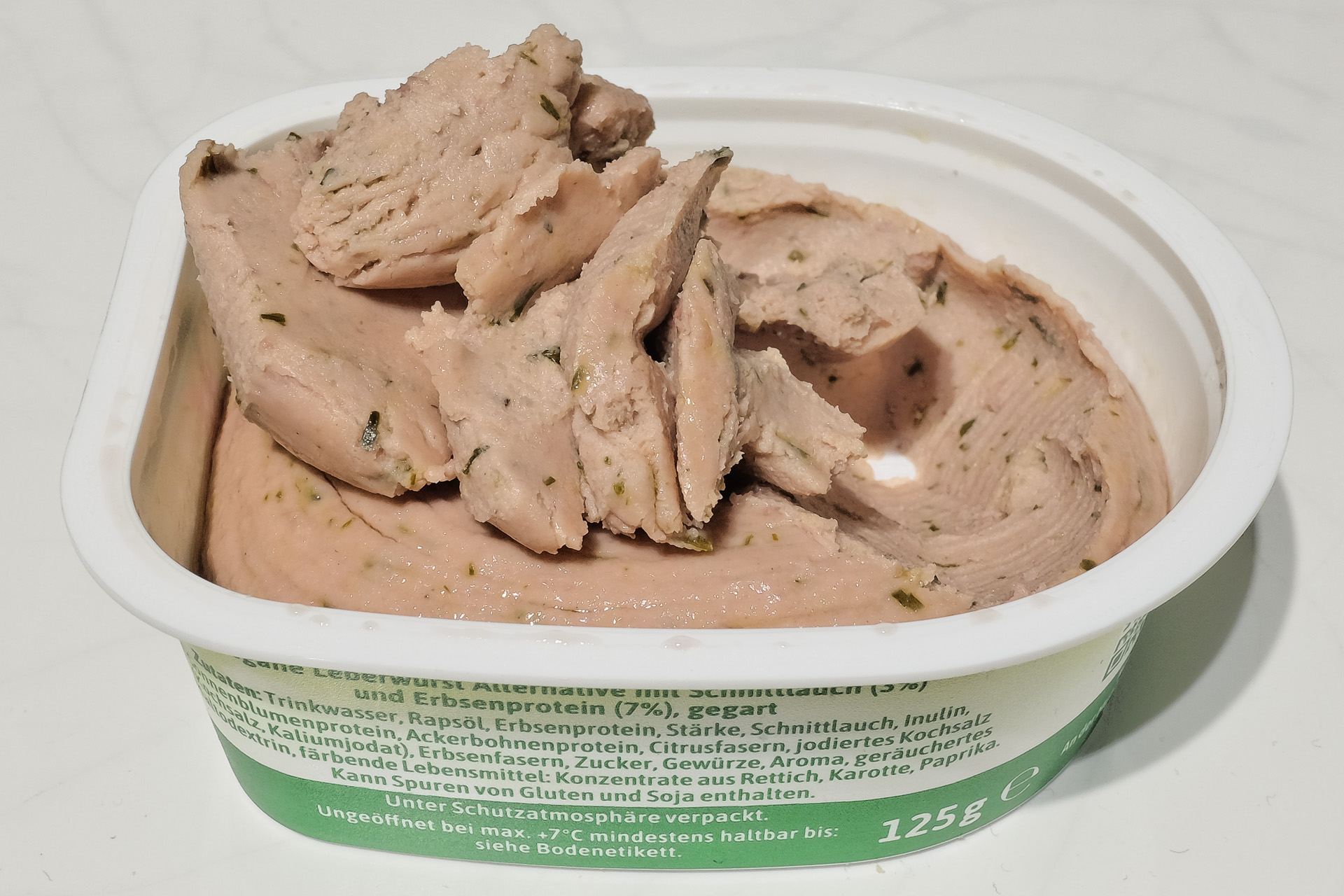 Vegane Pommersche Schnittlauch Vegane Leberwurst Alternative mit Schnittlauch (3%) und Erbsenprotein (7%), gegart