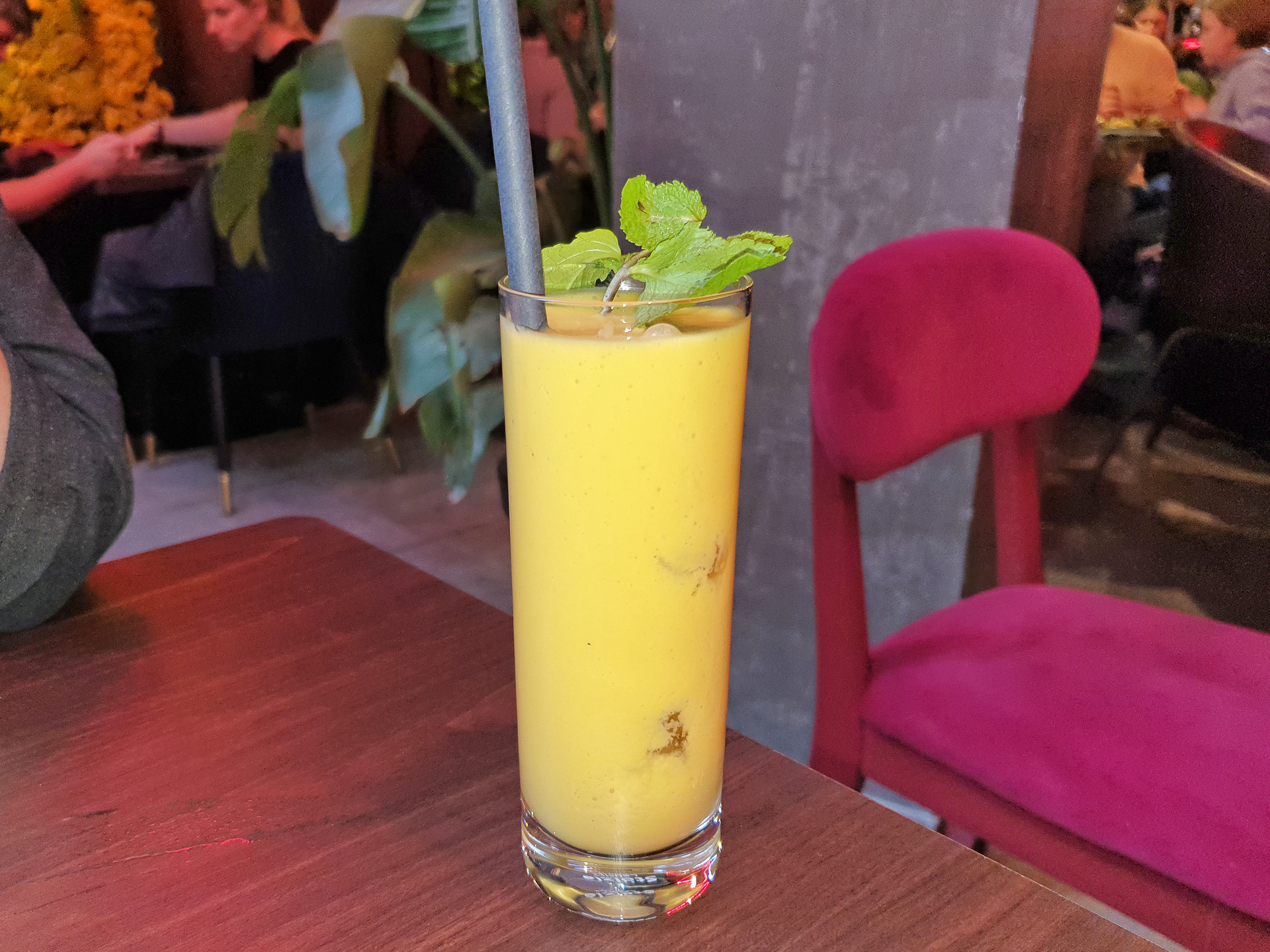 Der Mango Lassi enthielt Mango, Kokosmilch, Joghurt und Simple Sirup. er war schön cremig und hatte ein feines Aroma. Sehr lecker, Klasse.