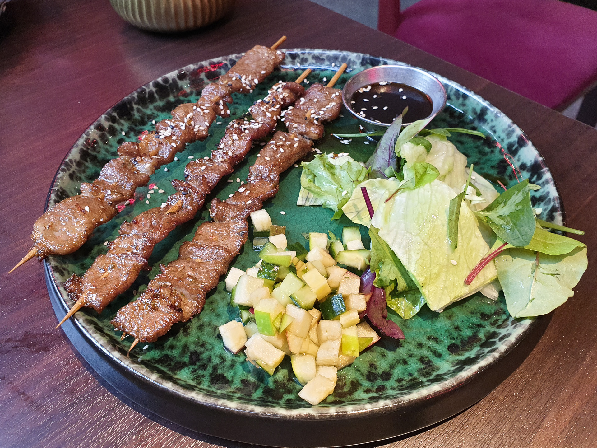 Der gegrillte Spieß (Mu Ping) vom Duroc-Schwein war sehr zart und saftig und hatte ein feines, leicht süßliches Aroma (Klasse). Dazu gab es einen Tamarinden Obstsalat mit Äpfeln und Gurke und einen Sesam Soja Dip. Sehr lecker.