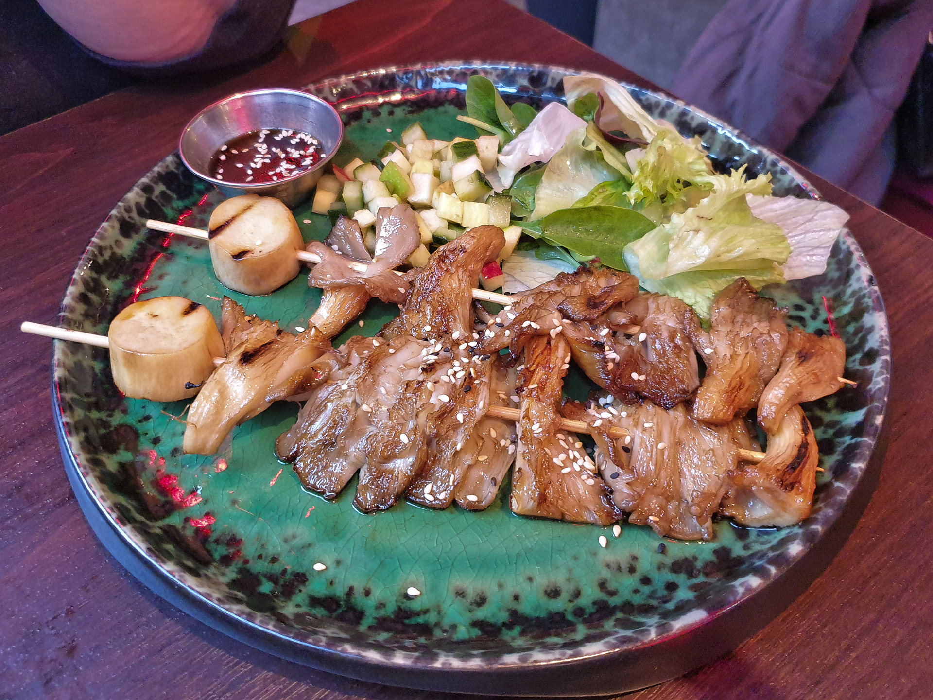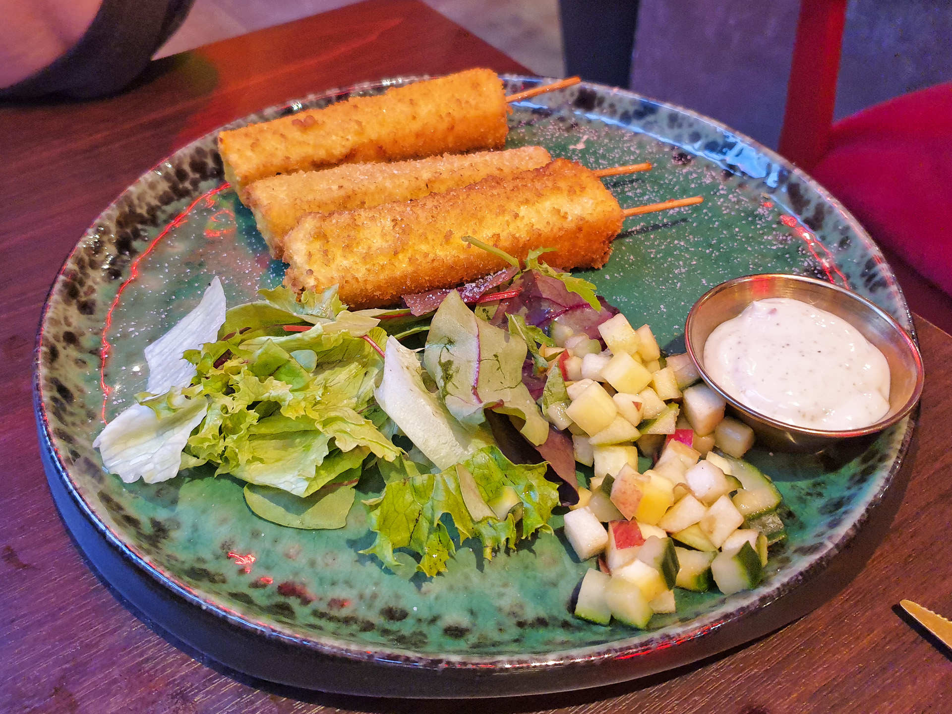 Der als Tempura frittierte Seidentofu hatte eine sehr zarte Textur und eine schön krosse Panade. Dazu gab es einen Salat mit Äpfeln und Gurke und einen Kaffir Mayo Dip. Sehr lecker.