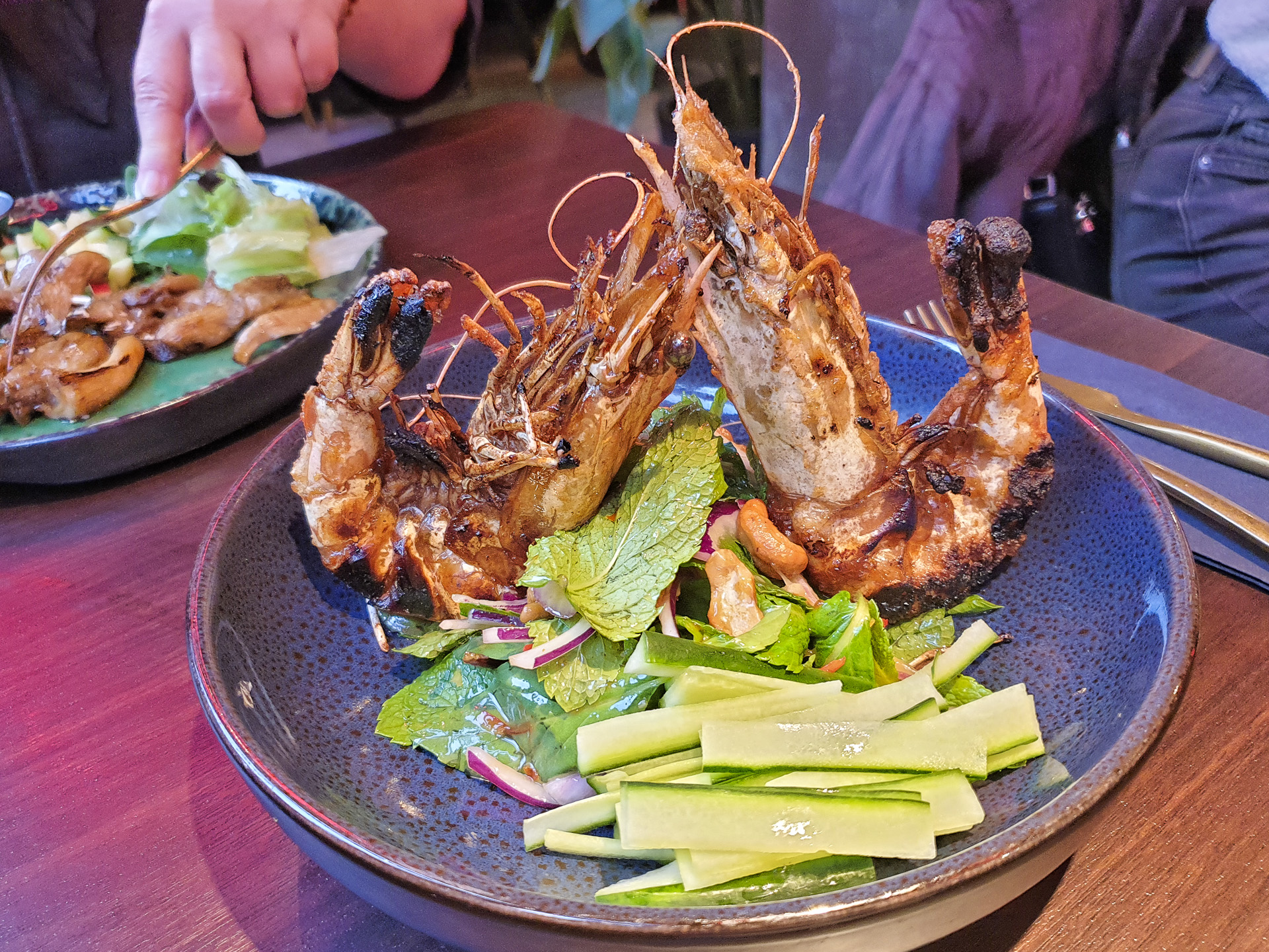 Gegrillte Riesen-Black-Tiger-Garnelen mit frischem Salat, Koriander, Minze und würzigem Chili-Kokos-Dressing, Cashewnüsse.