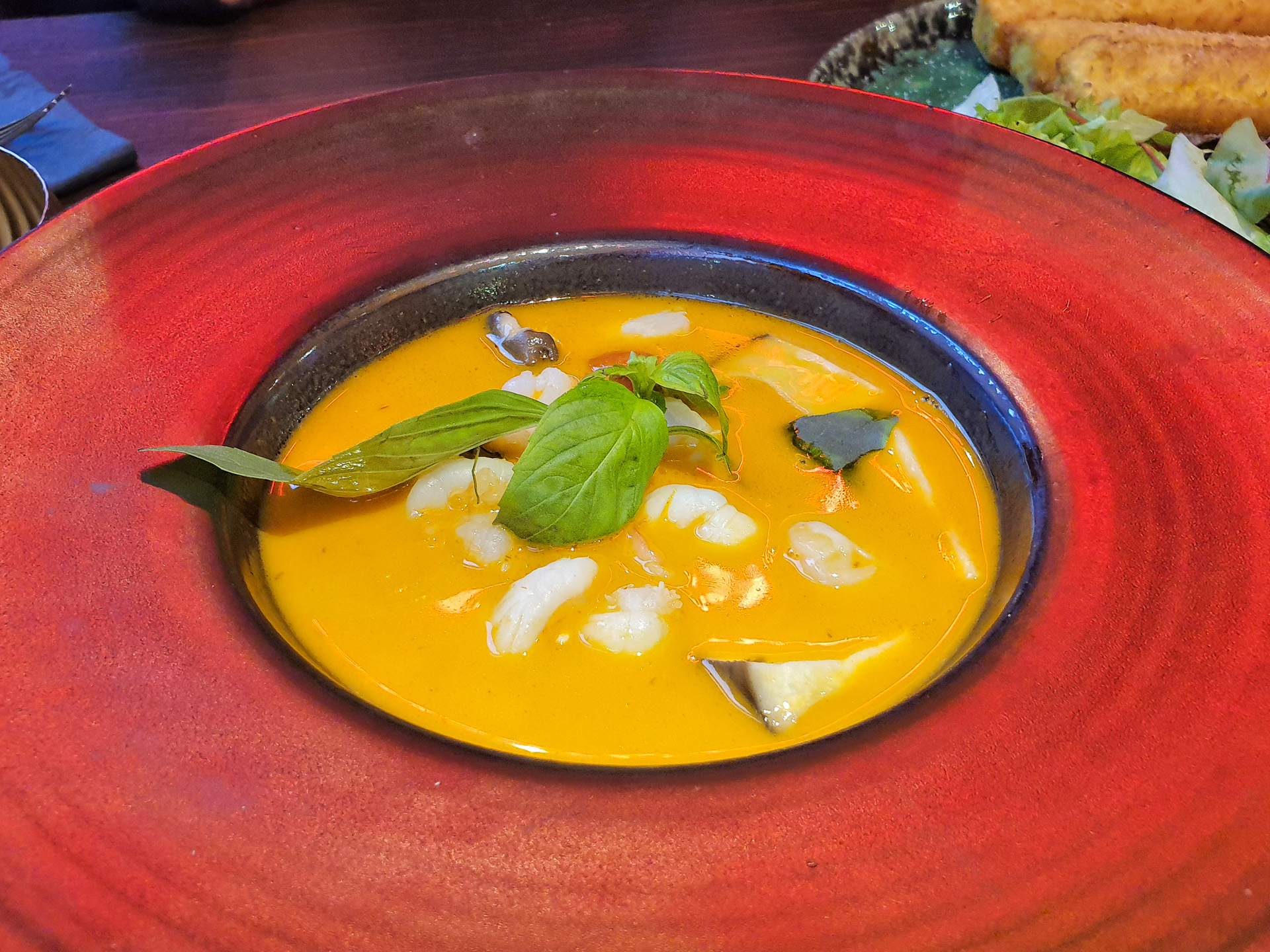 Die Tom Kha Gai auf der Basis einer Hühner Brühe enthielt Kokosmilch, Zitronengras, Galgant, Kaffirlimettenblätter, Limettensaft, Garnelen, Austernseitlinge, Kräuterseitling, Cherrytomaten und Thai-Basilikum. Die Garnelen hätten etwas knackiger sein können, die Pilze waren teilweise etwas zäh. Die Suppe war leicht cremig und hatte ein feines, leicht säuerlich pikantes Aroma. sehr lecker.