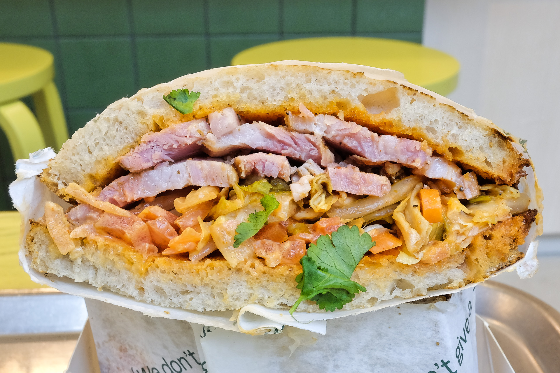 Das leicht getoastete Toastbrot war weich aber nicht pappig. Belegt war das Sandwich mit gepökeltem Schweinebauch, Kimchi, Pickles, einer Gochujang Creme und etwas Koriander. Der Schweinebauch war zart und hatte ein feines Aroma, das Kimchi fiel geschmacklich kaum auf, das geht deutlich besser (z.B. von THATs KiMCHi). Insgesamt leicht säuerlich pikant mit koreanischem Geschmacksbild. Sehr lecker.