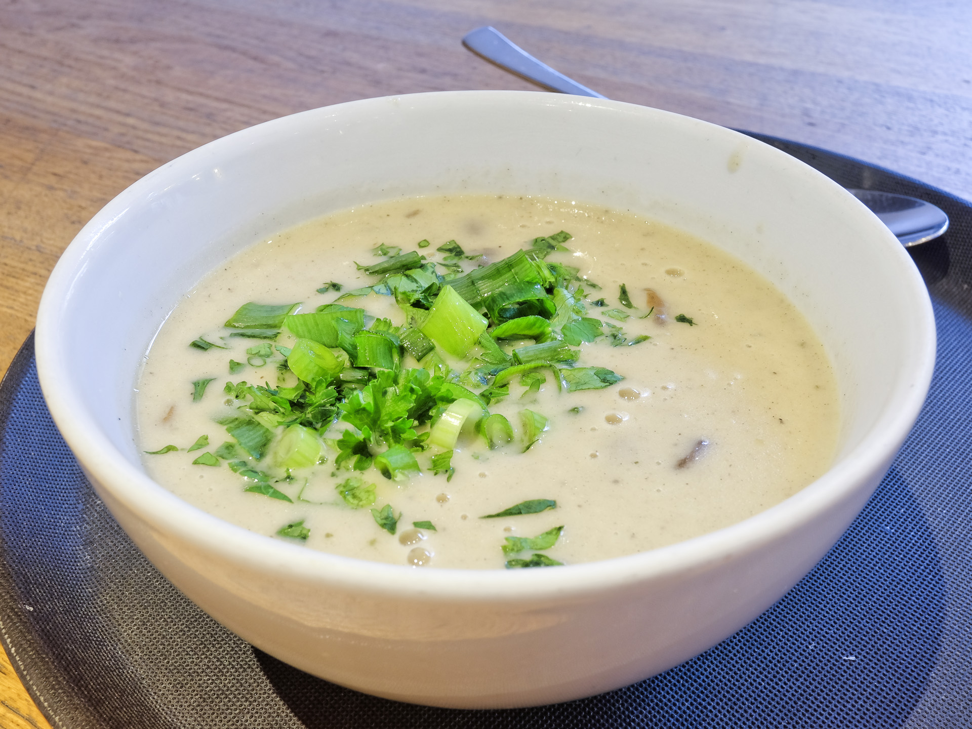 Die Pilz Cremesuppe verströmte einen feinen Pilzduft und hatte ein feines elegantes Aroma. Sie enthielt Champignons, Austernpilze, Pfifferlinge, Stockschwämmchen, Zwiebeln, Creme Fraiche und Weißwein. Sehr lecker, Klasse.