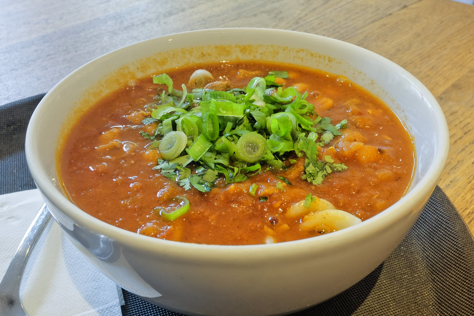Harira ist ein Eintopf der marokkanischen Küche, er enthielt Lammfleisch, Kichererbsen, Zwiebeln, Linsen, Tomaten und als Extra ein paar Nudeln. Das Lammfleisch war zart und hatte ein kräftiges Aroma, der Eintopf war aromatisch und leicht pikant. Sehr lecker.