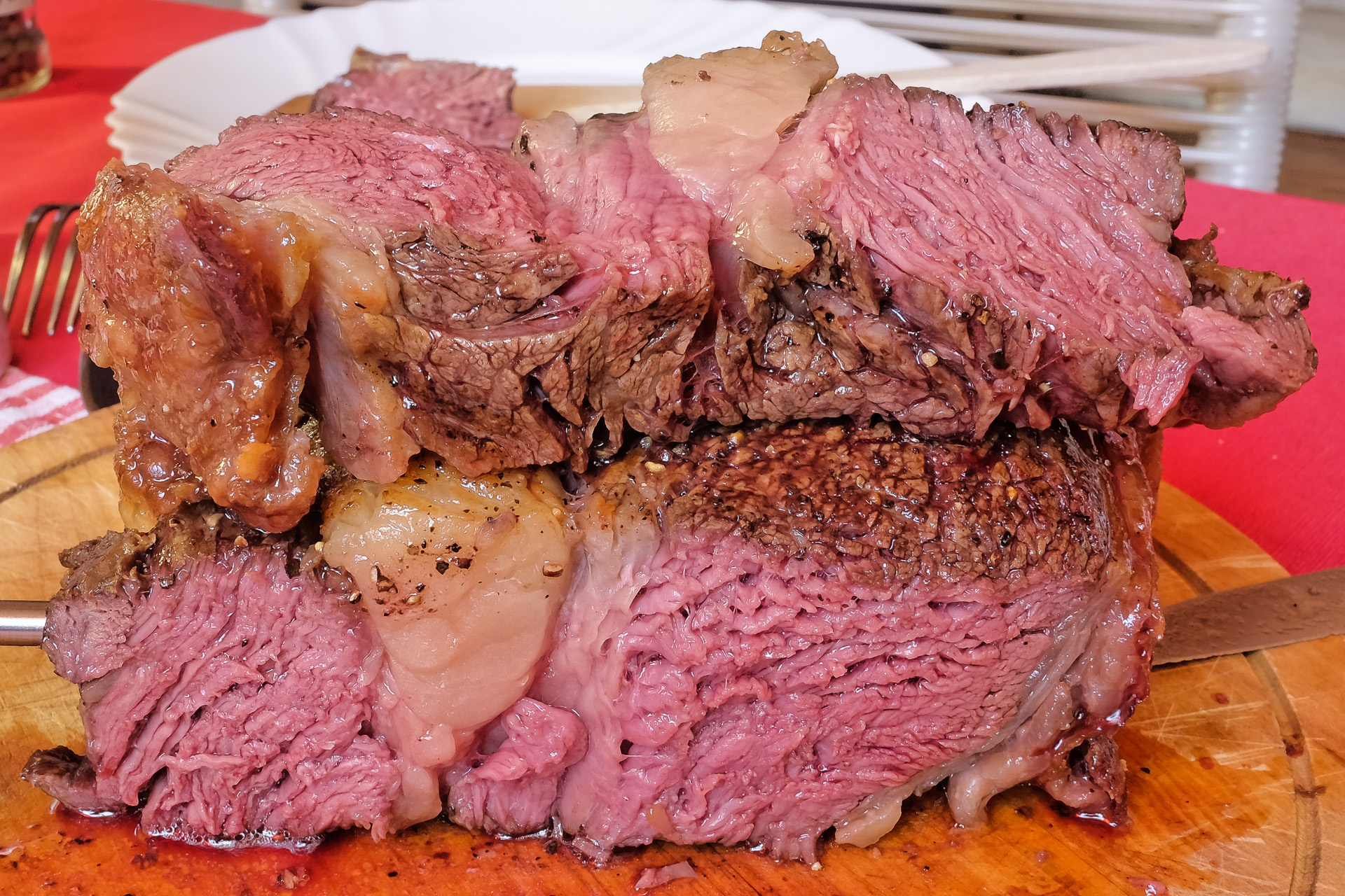 Nach dem Anbraten in der Pfanne wanderte das gute Stück bei 125 °C mit einem Bratenthermometer in den Backofen. Nach 1 h 5 min hatte es eine Kerntemperatur von 58 °C.