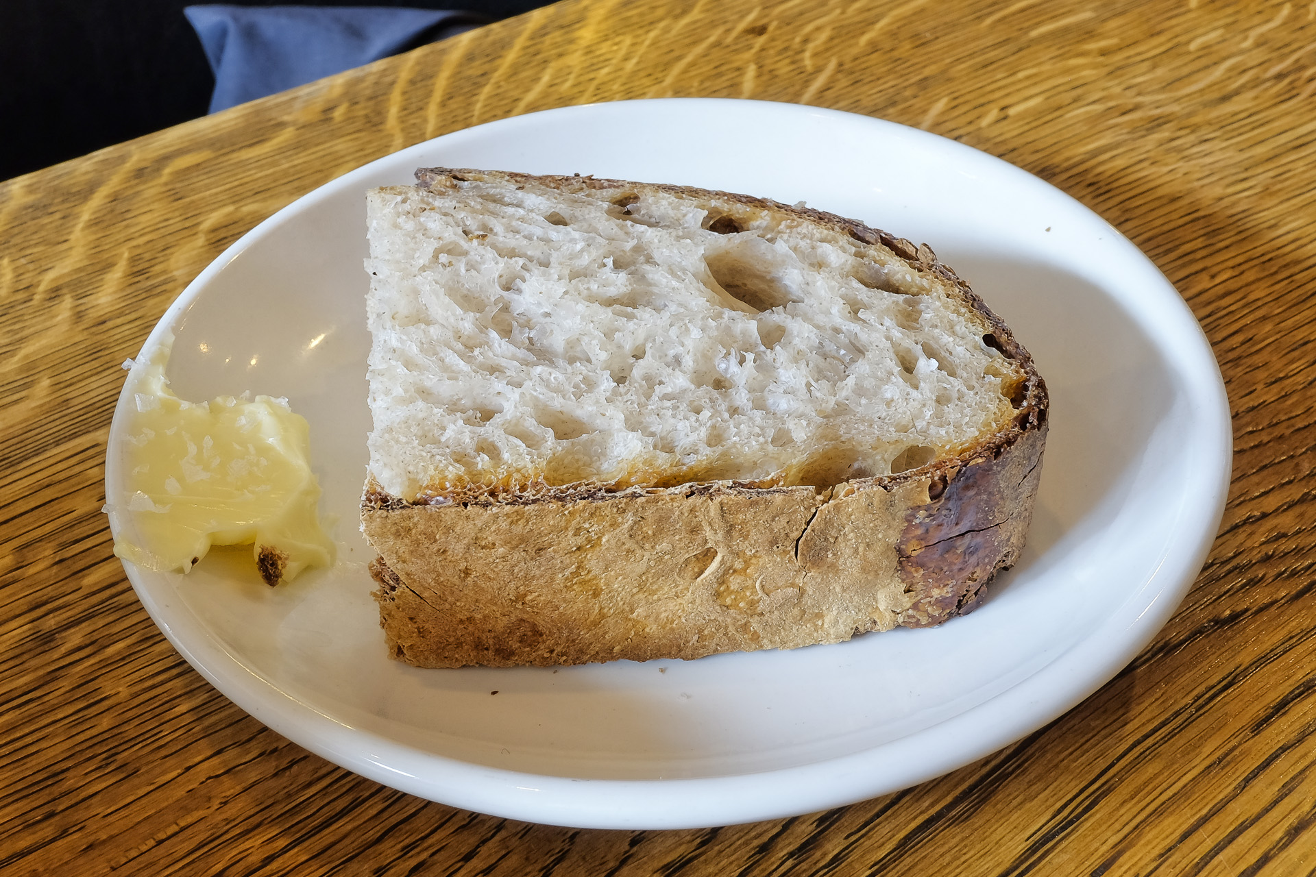 Dazu wurde noch etwas Brot und Butter gereicht. Das Brot hatte eine etwas zähe Kruste und eine lockere weiche Krume, sehr lecker.