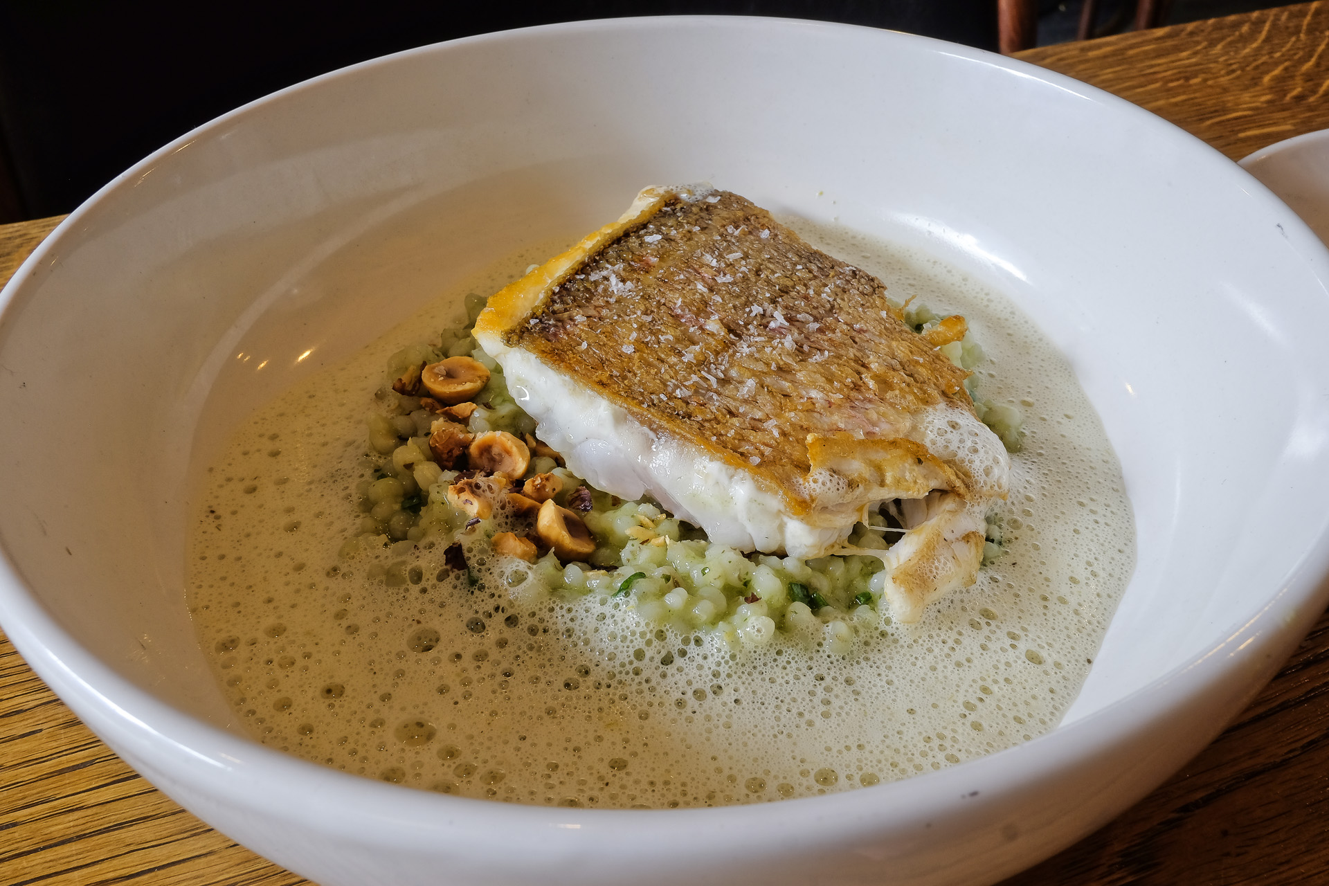 Das Perlgraupen Risotto war angenehm al dente und hatte eine leicht pikante Schärfe. Gewürzt war es mit etwas Estragon und Schnittlauch, dazu gab es ein paar geröstete Haselnüsse. Die Rotbrasse hatte eine leicht krossen Haut und ein feines Aroma. Ein schönes Gericht, sehr lecker.
