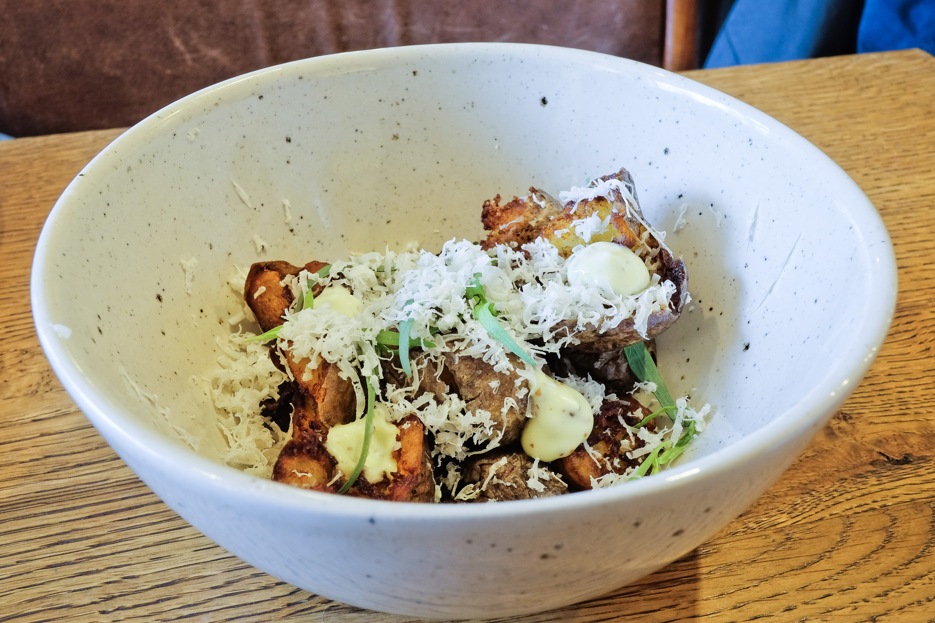 Die Drillinge wurden wahrscheinlich vorgekocht und anschließend mit Schale im Ofen gegart. Sie waren innen zart und aussen leicht kross und hatten ein feines Aroma. Dazu gab es etwas Mayonnaise, Estragon und geriebenen, sehr dezenten Meerrettich. Eine originelle Zubereitung, sehr lecker.