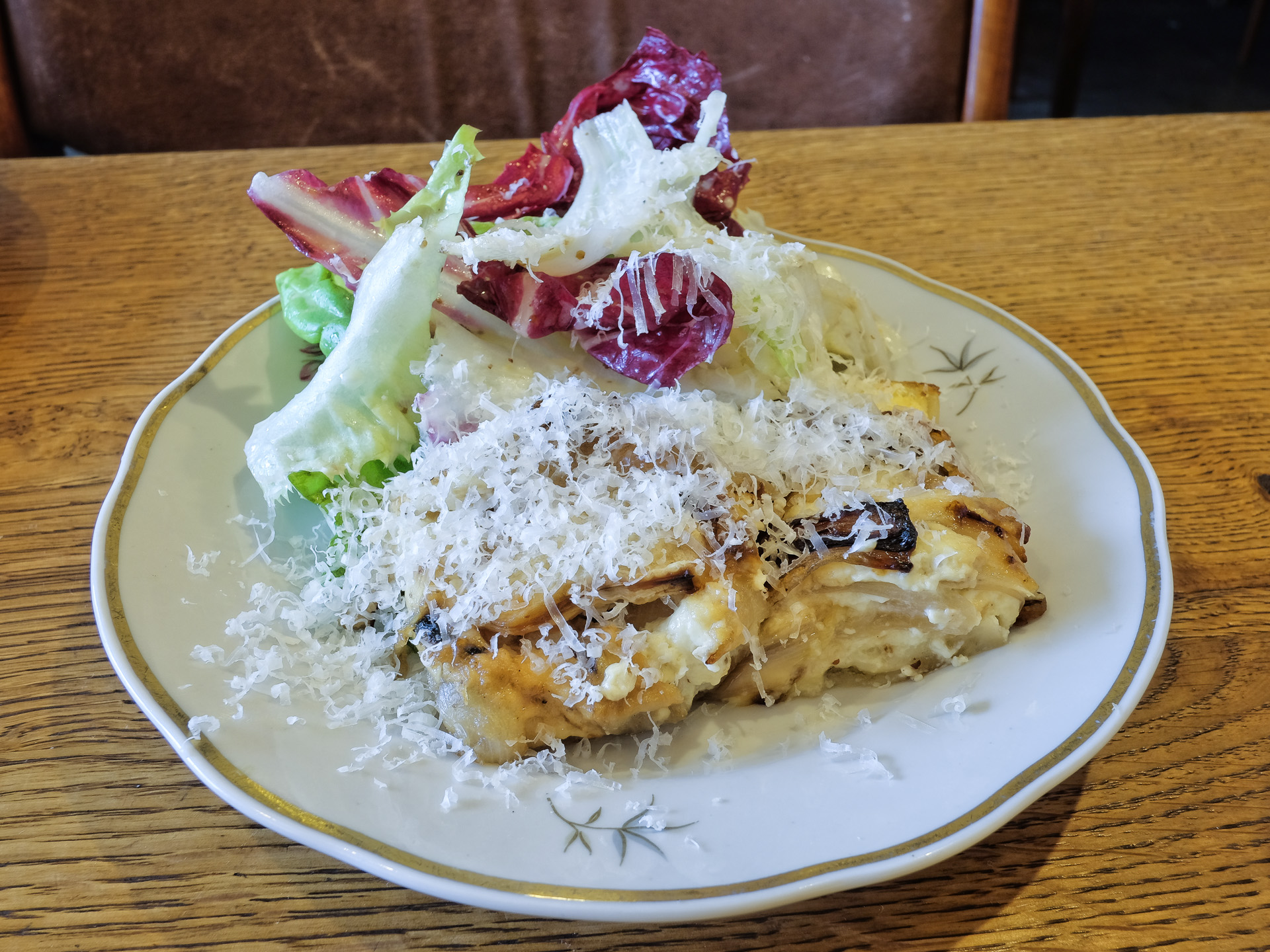 Der Zwiebel Quiche mit Brie war zart und hatte ein feines Aroma. Dazu gab es etwas Salat (Römersalat, Radicchio) und etwas gehobelten Käse. Sehr lecker.