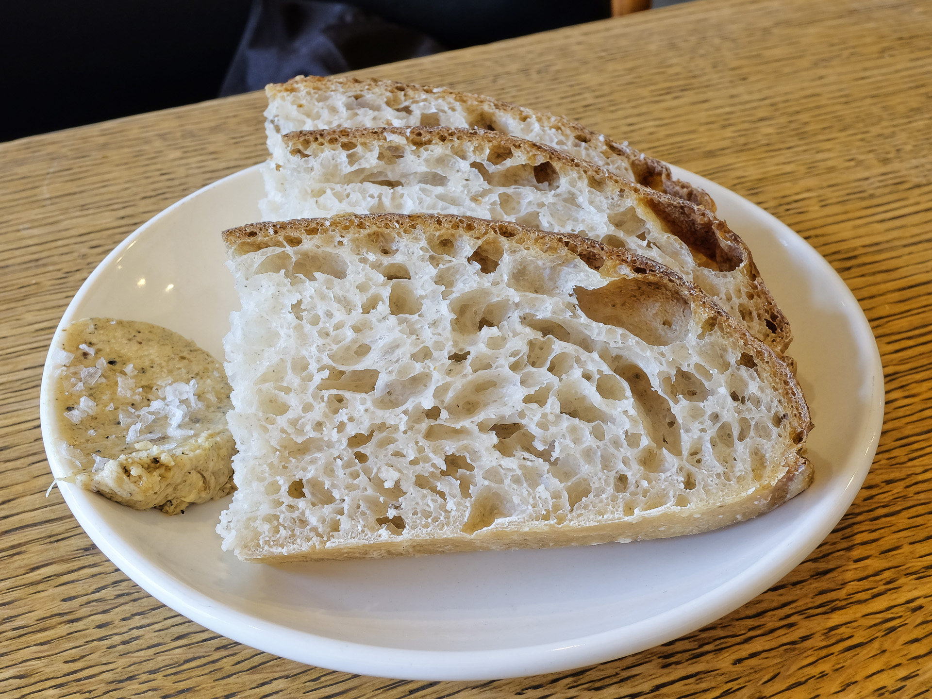 Vor dem Menü wurde etwas Brot und eine Butter mit eine Art Röstzwiebeln gereicht, sie hatte ein feines, leicht süßliches Aroma moit einem Hauch Säure. Sehr lecker.