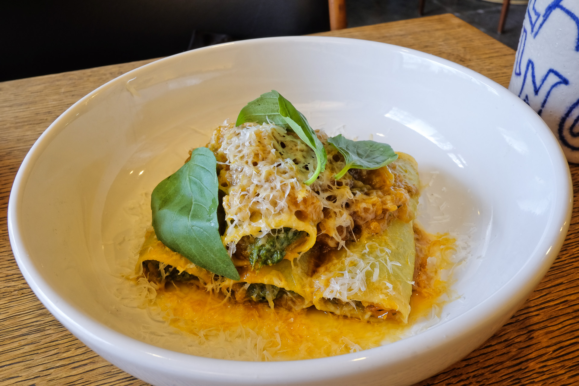 Die Cannelloni waren leicht al dente, gefüllt waren sie mit Blattkohl und Ricotta. Dazu gab es eine Sauce aus fermentierten Tomaten, etwas geriebenen Käse und etwas Basilikum. Sehr lecker.