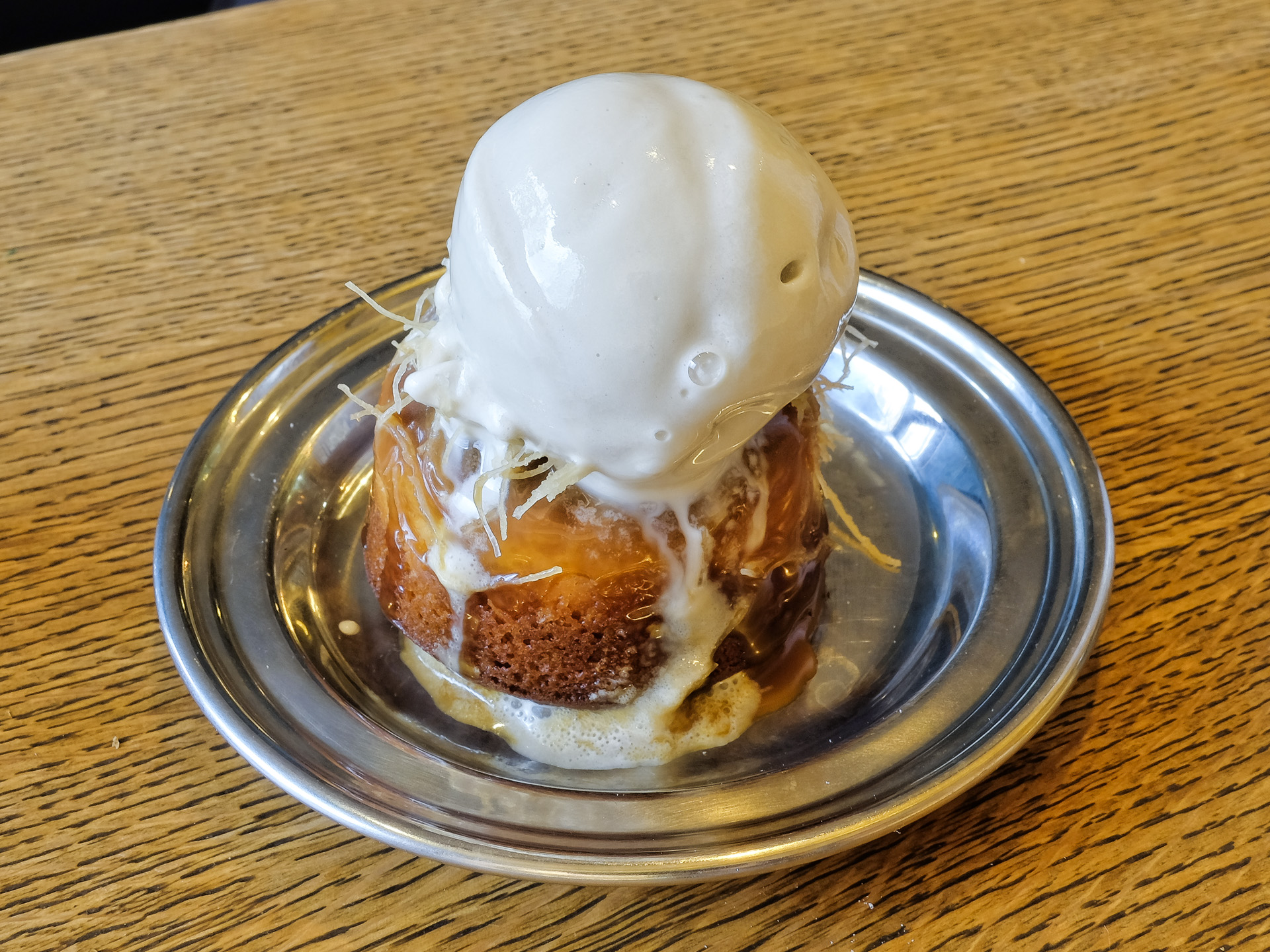 Als Dessert gab es einen kleinen Sandkuchen mit Salz Karamell, etwas Engelshaar und ein Heumilch Eis. Das Salz Karamell hatte ein feines Aroma und eine angenehme Textur, das Heumilch Eis war sehr cremig und hatte ein feines Aroma. Sehr lecker, Klasse.