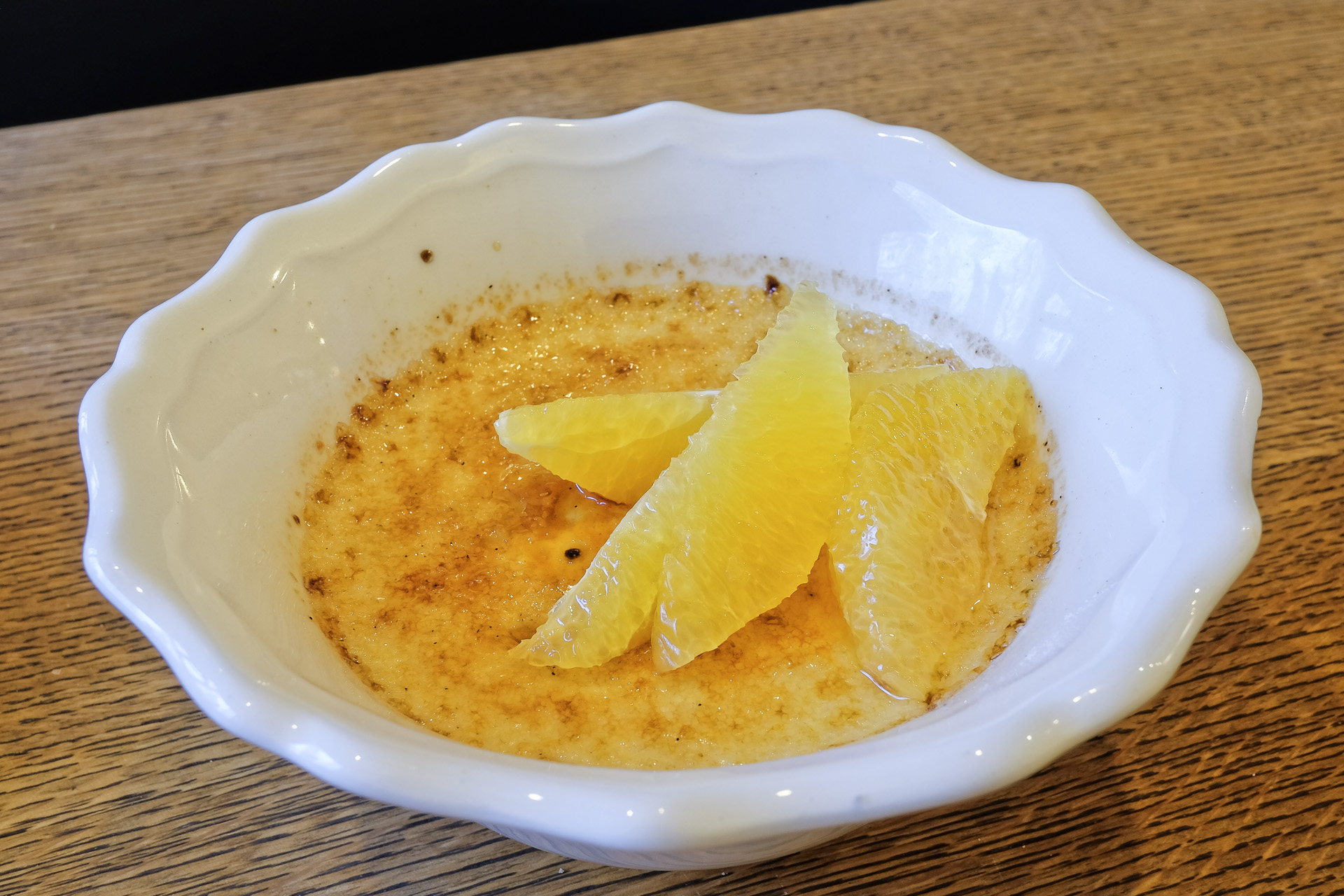 Die Creme Brulee hatte eine perfekte Textur und ein feines Aroma, die Zuckerkruste war schön dünn und kross. Auch die Temperatur war perfekt mit einer leicht kühlen Creme in einer warmen Schale. Dazu gab es noch ein paar Orangenfilets. Sehr lecker, Klasse.